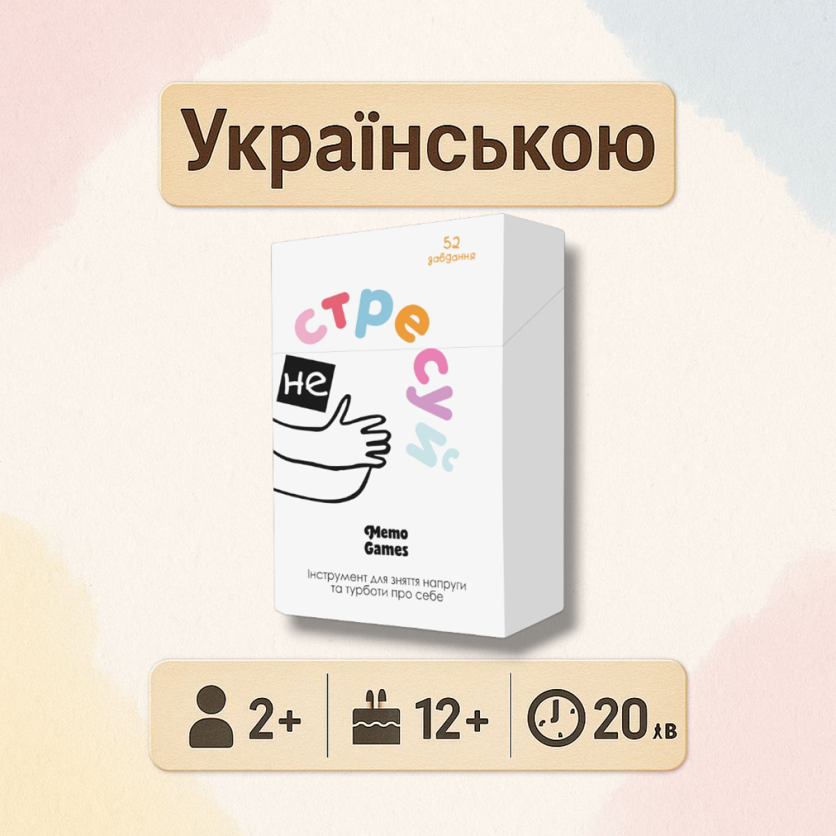 ???? “Не стресуй“ – це весела та розслаблююча настільна гра, яка допоможе відволіктися від щоденних турбот, зняти напругу та зарядитися позитивом. Ця гра створена, щоб нагадати вам: не варто хвилюватися через дрібниці – просто насолоджуйтеся моментом!