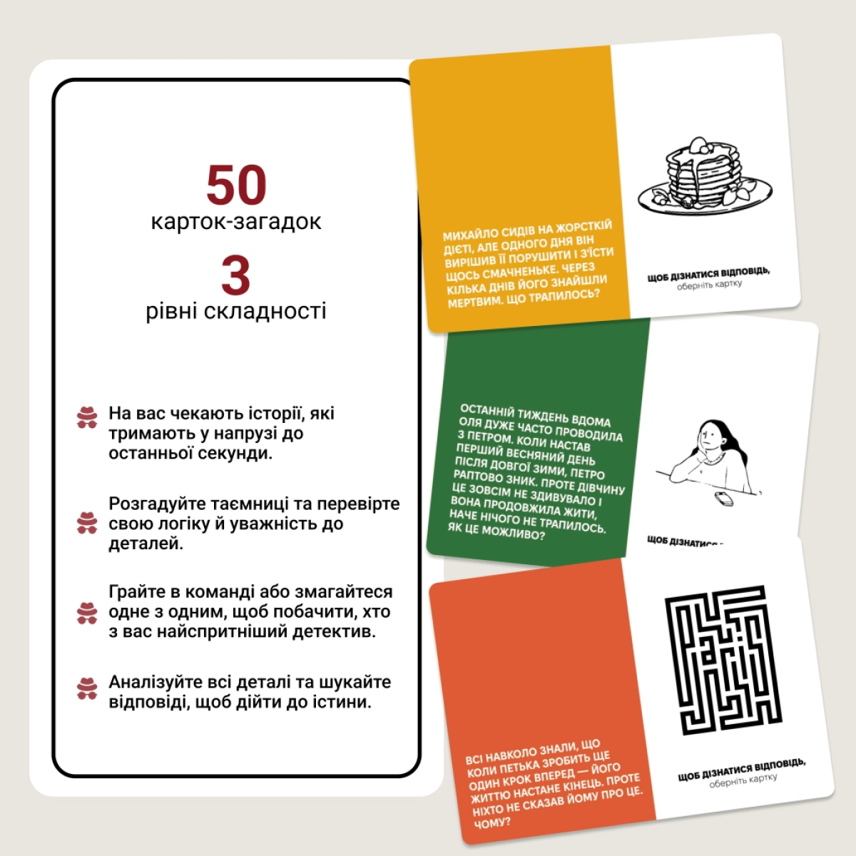 Ця гра чудово підходить для вечорів з друзями або родиною. Вона розвиває логічне мислення, уважність та здатність до дедукції, адже кожен хід наближає вас до розгадки таємниці.