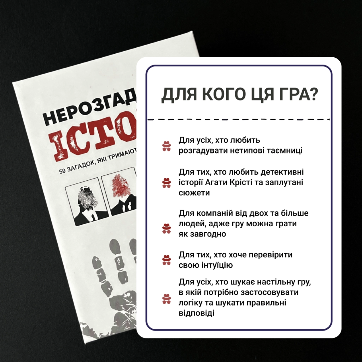 “Нерозгадані історії“ підходять для тих, хто любить загадки, інтриги та розслідування. Вона буде цікава як дорослим, так і дітям, які хочуть спробувати свої сили в розкритті таємниць. Це чудовий вибір для дружніх вечірок або сімейних посиденьок.