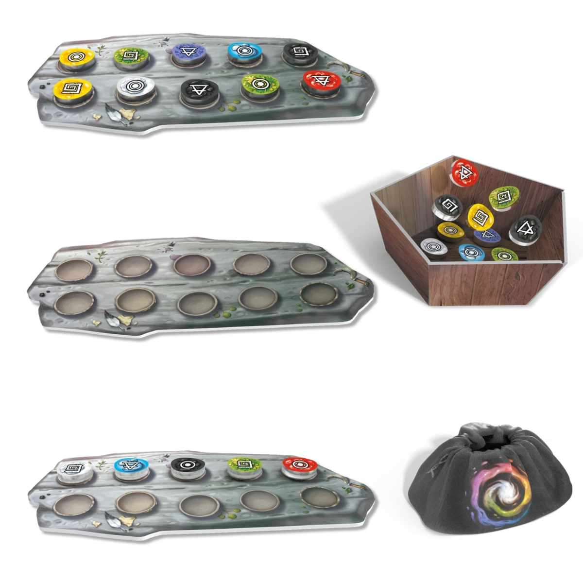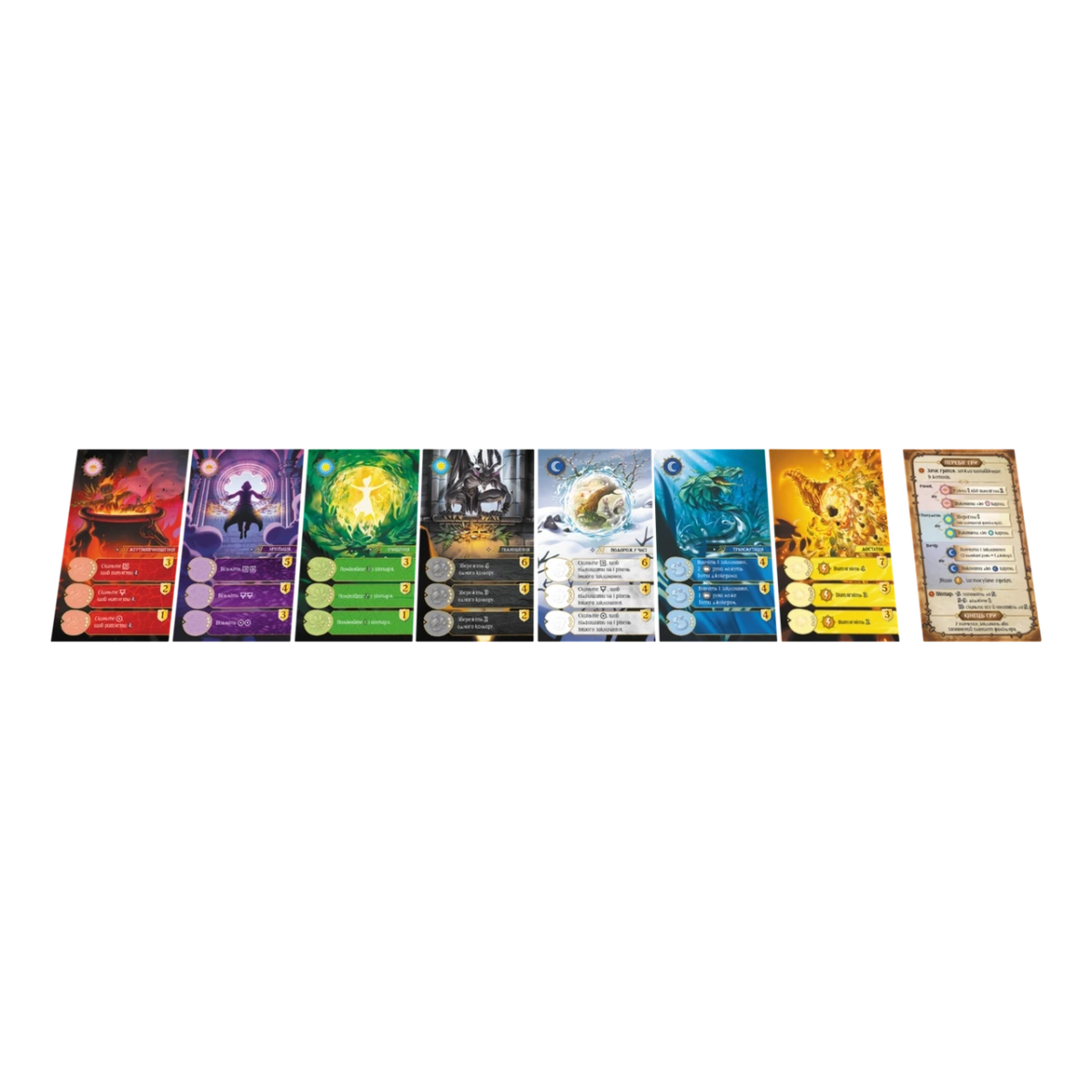 У грі є 7 кольорів заклинань й матерії відповідно. Крім того, на матерії існують руни, що часто теж важливо для створення заклять. Заклинання мають декілька рівнів покращення, та особливі властивості. Деякі заклинання будуть давати вам можливість зіграти додаткові дії під час певних фаз дня(раунду). Таким чином розвиваючи свою книгу магії ви зможете кожен хід запускати потужний алгоритм, що приведе вас до перемоги.