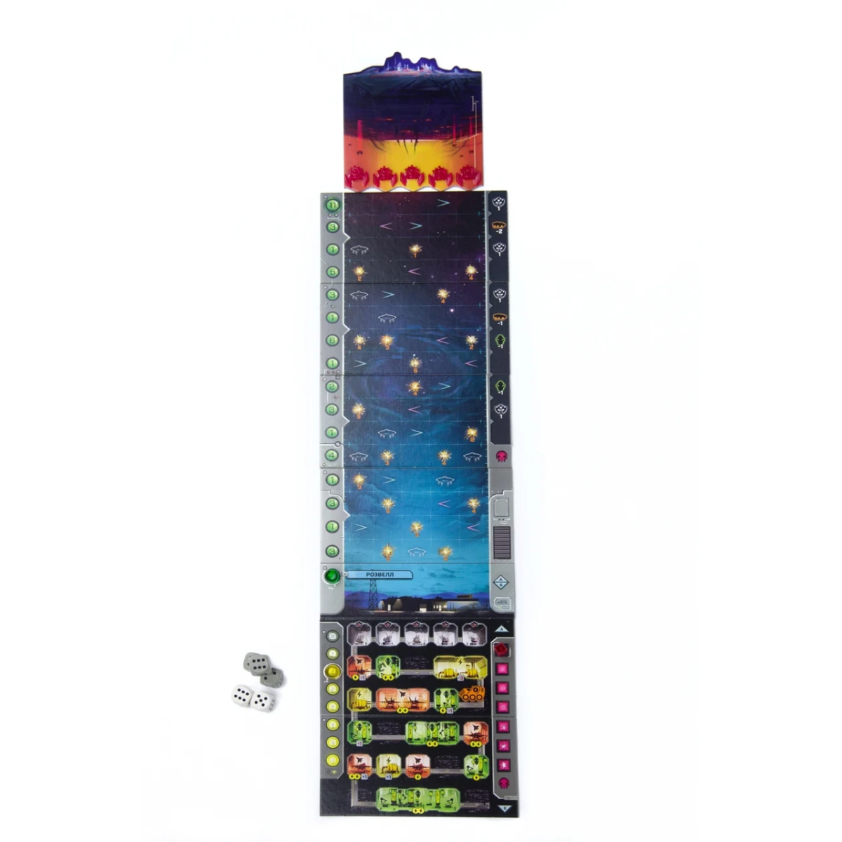 Усе це втілюється за допомогою виставлення на клітини ігрового поля кубиків. Від того, які значення наявні на гранях виставлених кубиків, залежить ефективність ваших дій.