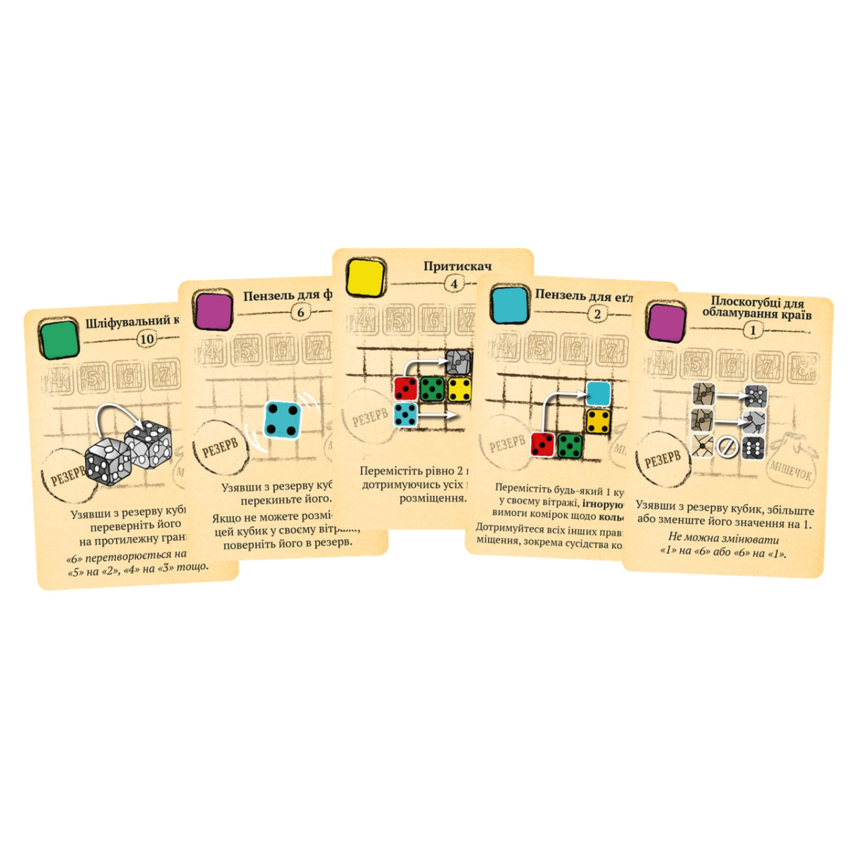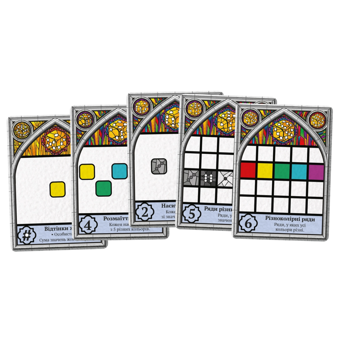 Протягом гри учасники кидають кольорові кубики та розміщують їх на особистих планшетах, щоб створити вітраж. Проте не все так просто: кольори й значення кубиків потрібно розміщувати за особливими правилами, а спеціальні карти цілей додають ще більше тактичних викликів!