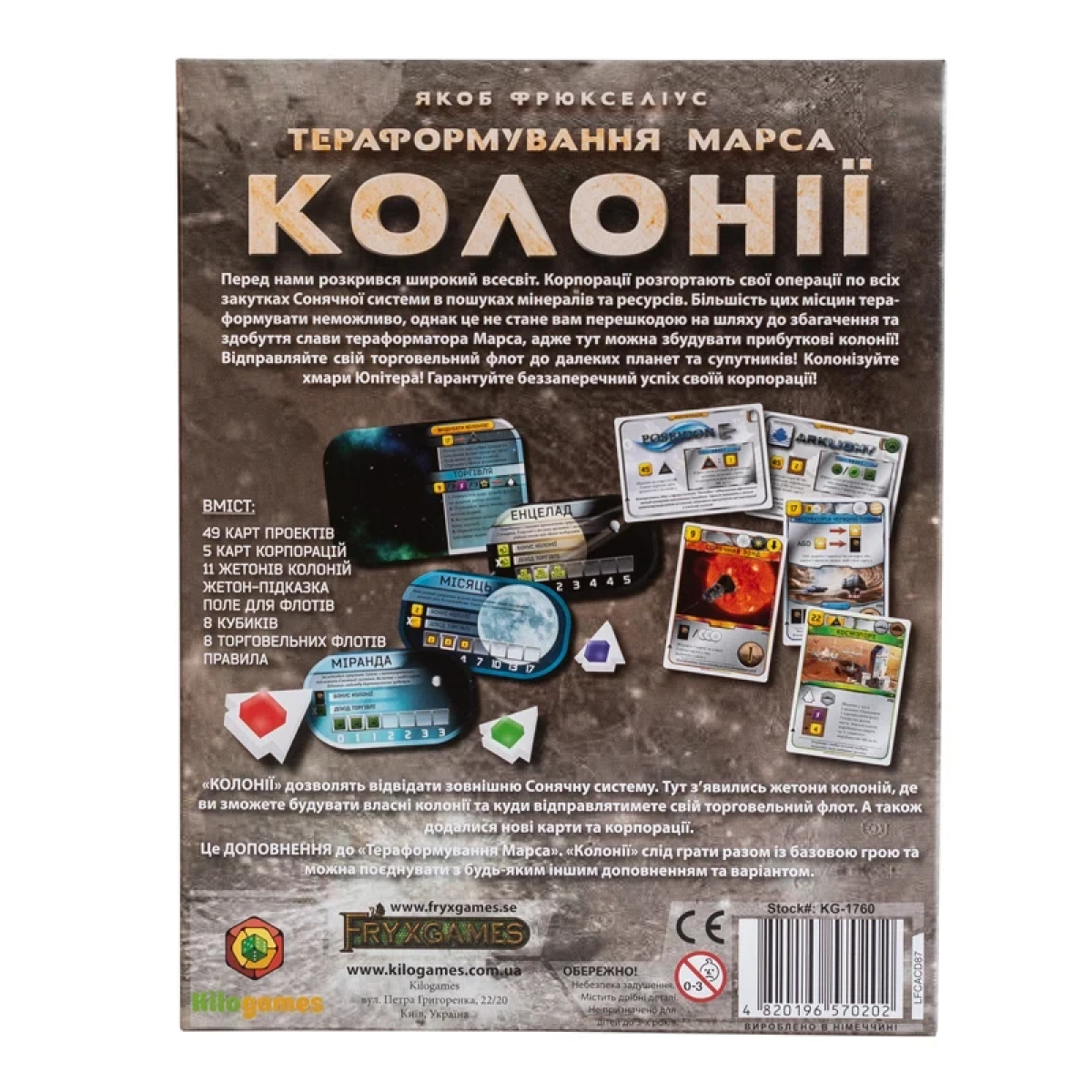 Тераформування Марса: Колонії – це гарне доповнення до гри, яке додає нових механік та можливостей у ігровий процес, при цьому не ускладнюючи його. Можливість отримати необхідні ресурси з колоній для оплати проєктів на Марсі точно знадобиться багатьом!
