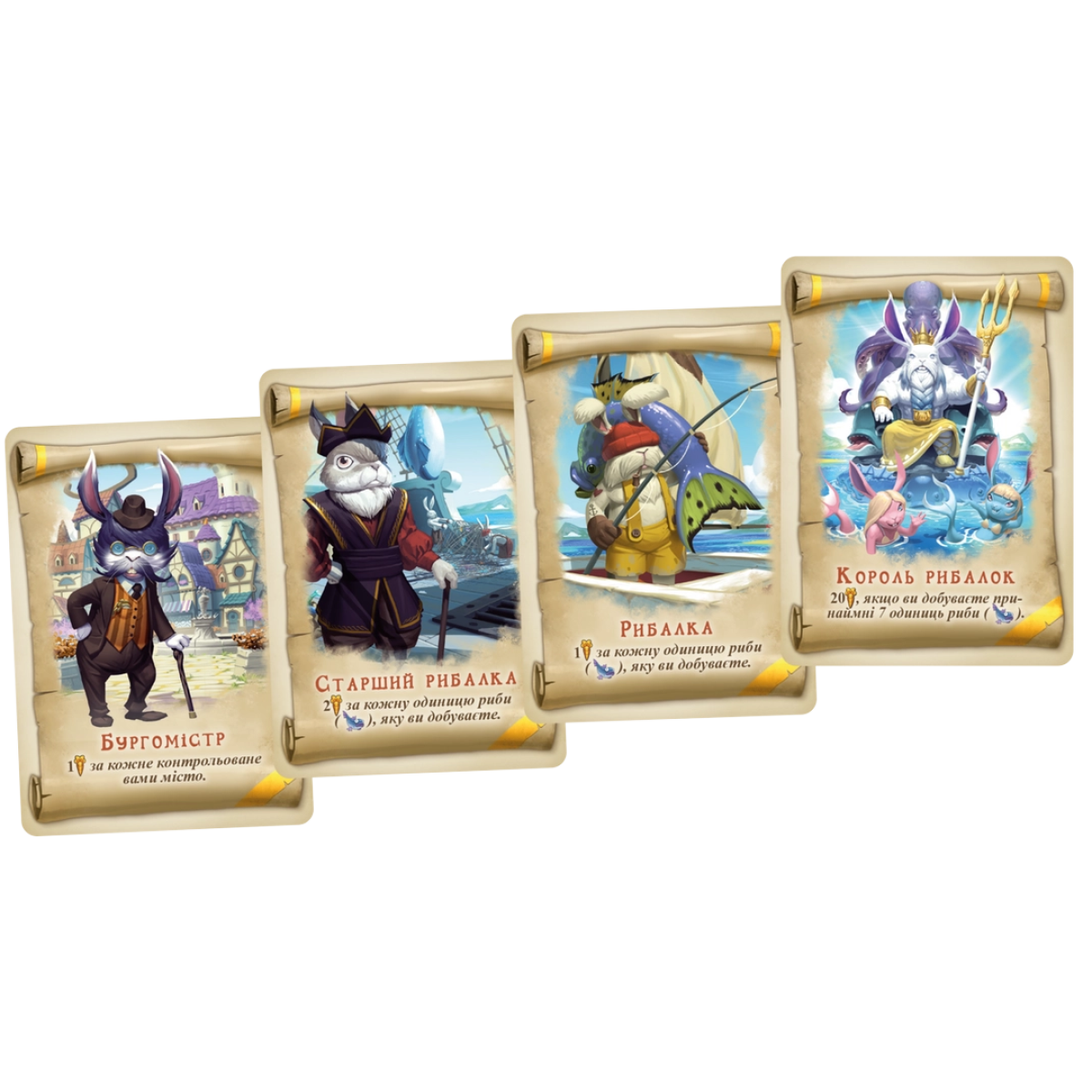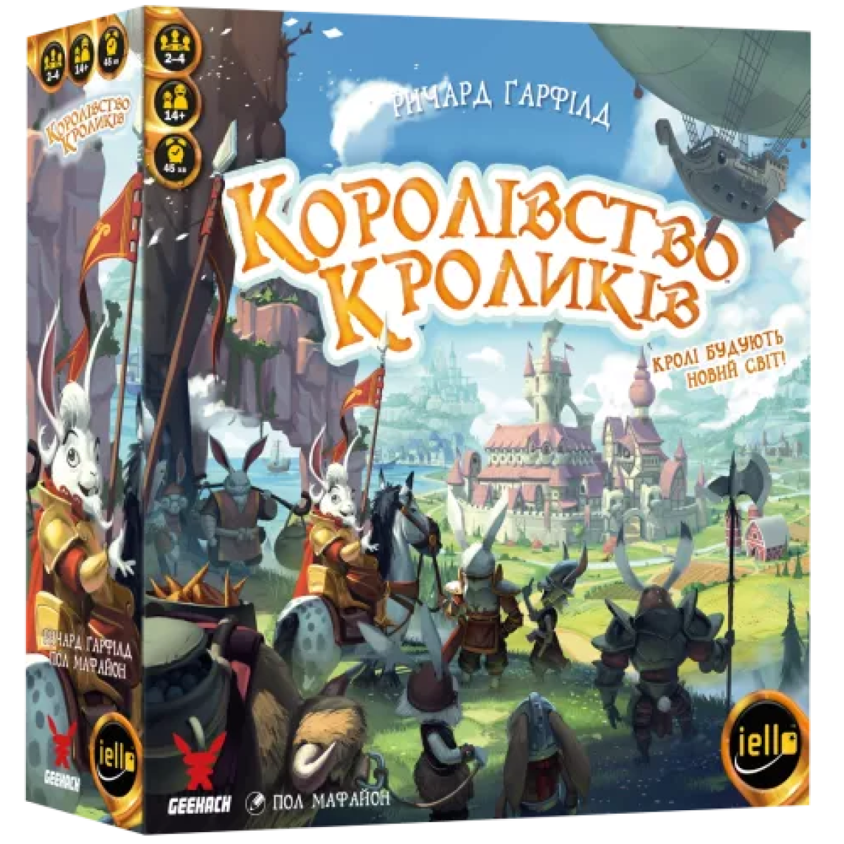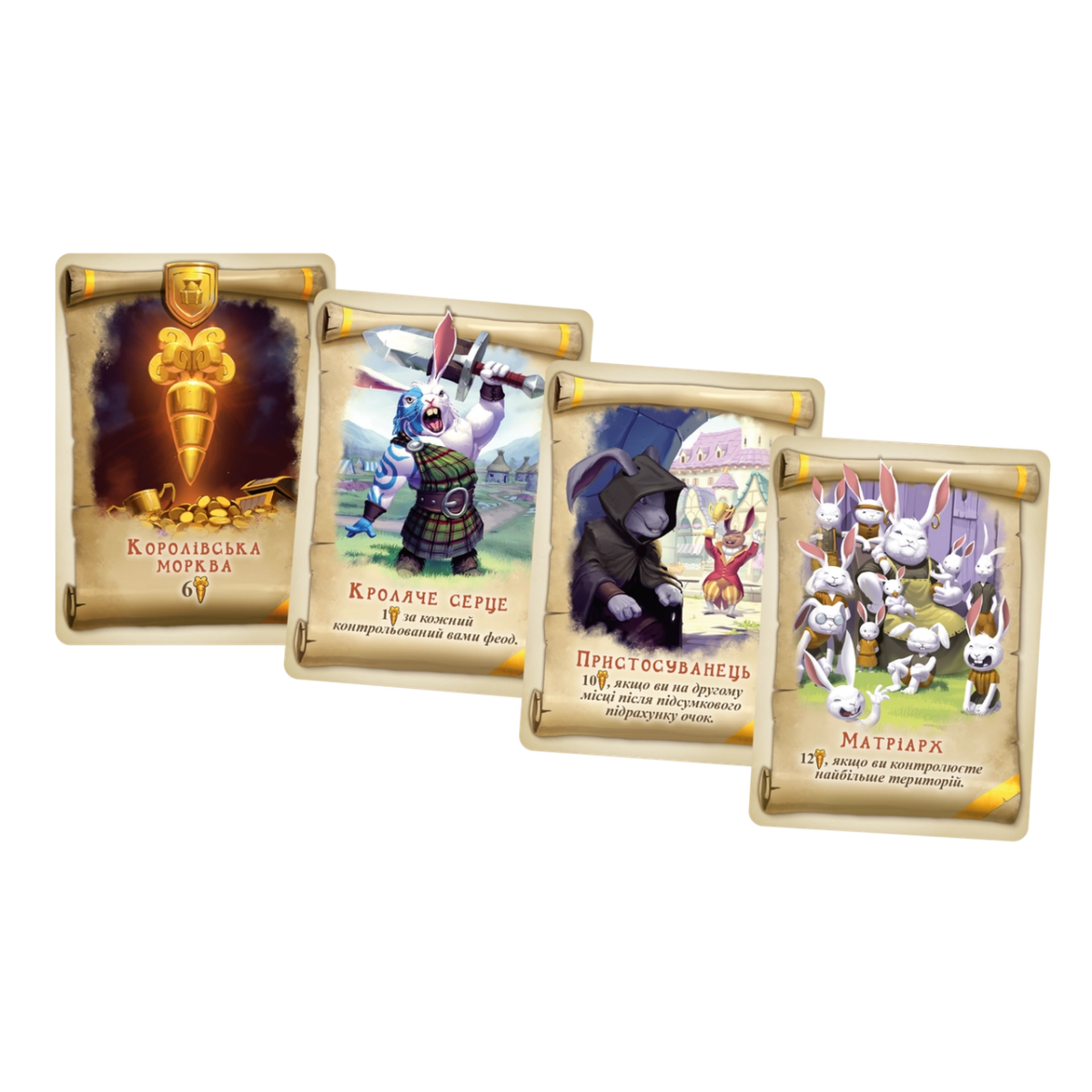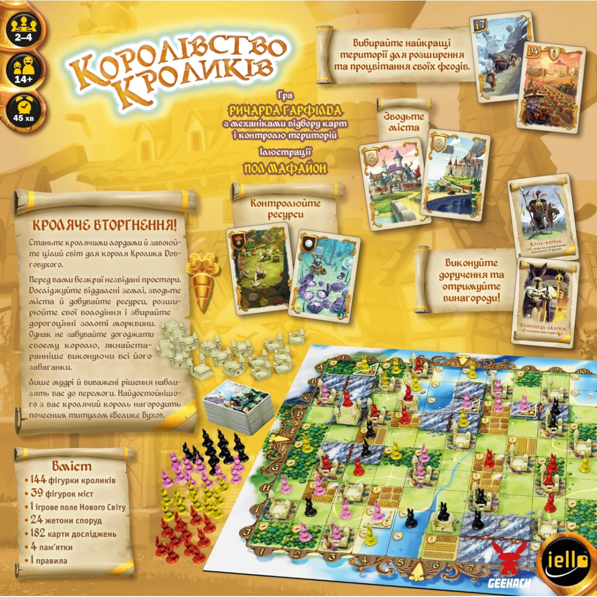 Описание: “Королівство кроликів“ — это стратегическая настольная игра для 2-4 игроков, в которой игроки берут на себя роль кроликов, строящих свои королевства. Игроки соревнуются за ресурсы, территории и очки победы, используя тактику, чтобы добиться наивысшего результата. Игра предлагает уникальное сочетание механик, включая драфт карт и управление ресурсами.