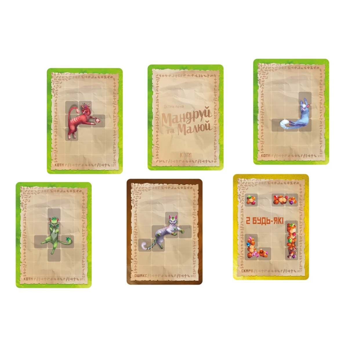 Коти, окси та скарби зображені у формі фігур. Коли гравець активує таку карту, він малює маркером відповідного кольору зображену фігуру на вільних клітинах свого корабля, вибравши потрібну орієнтацію. Коли гравець активує карту завдання, він знаходить таке ж завдання на своєму аркуші та святкує його.