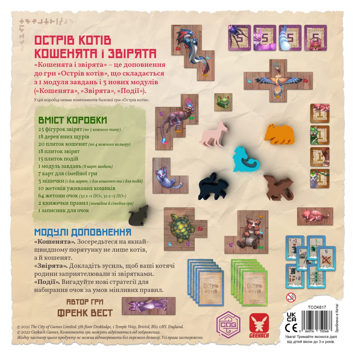 Доповнення «Острів котів: Кошенята та звірята» складається з трьох окремих модулів — «Кошенята», «Звірята» та «Собичення», які можна використовувати як разом, так і окремо. Також у комплекті невеликий модуль нових занять. Якщо ви хочете урізноманітнити базову гру, розширити стратегічні можливості та спробувати нові тактики, тоді Гікач настійно рекомендує купити це доповнення.