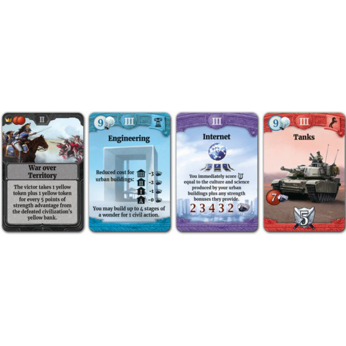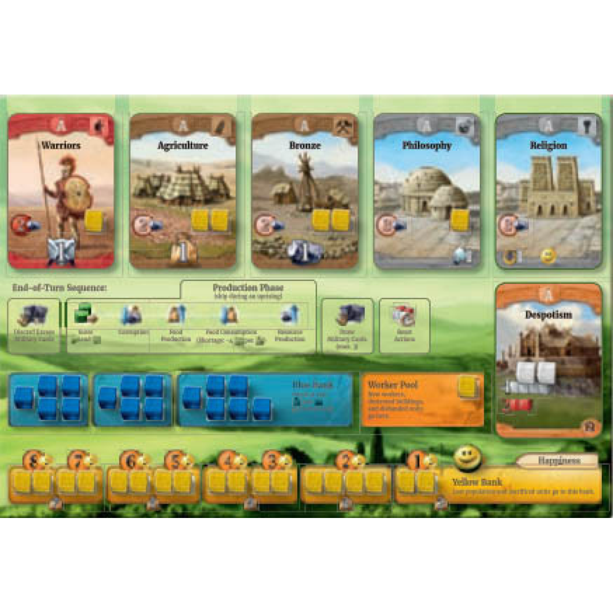 Мета вашої Цивілізації — перевага над іншими в культурному розвитку. Саме це стане визначальним чинником для визначення переможця. Для зображення вашого культурного розвитку використовується трек, на якому відбивається рейтинг усіх цивілізацій: стан і приріст. Аналогічний трек використовується для зображення наукового потенціалу та накопичених окулярів науки. Вся інформація щодо керування цивілізацією розміщена на особистому планшеті. Для виробництва ресурсів і провізії необхідно відправити робітників на роботу в шахту або на ферму — переміщення з ділянки незанятих робітників. Якщо немає вільних робітників, необхідно залучити населення — переміщуємо кубики з треку населення в зону незанятих робочих.