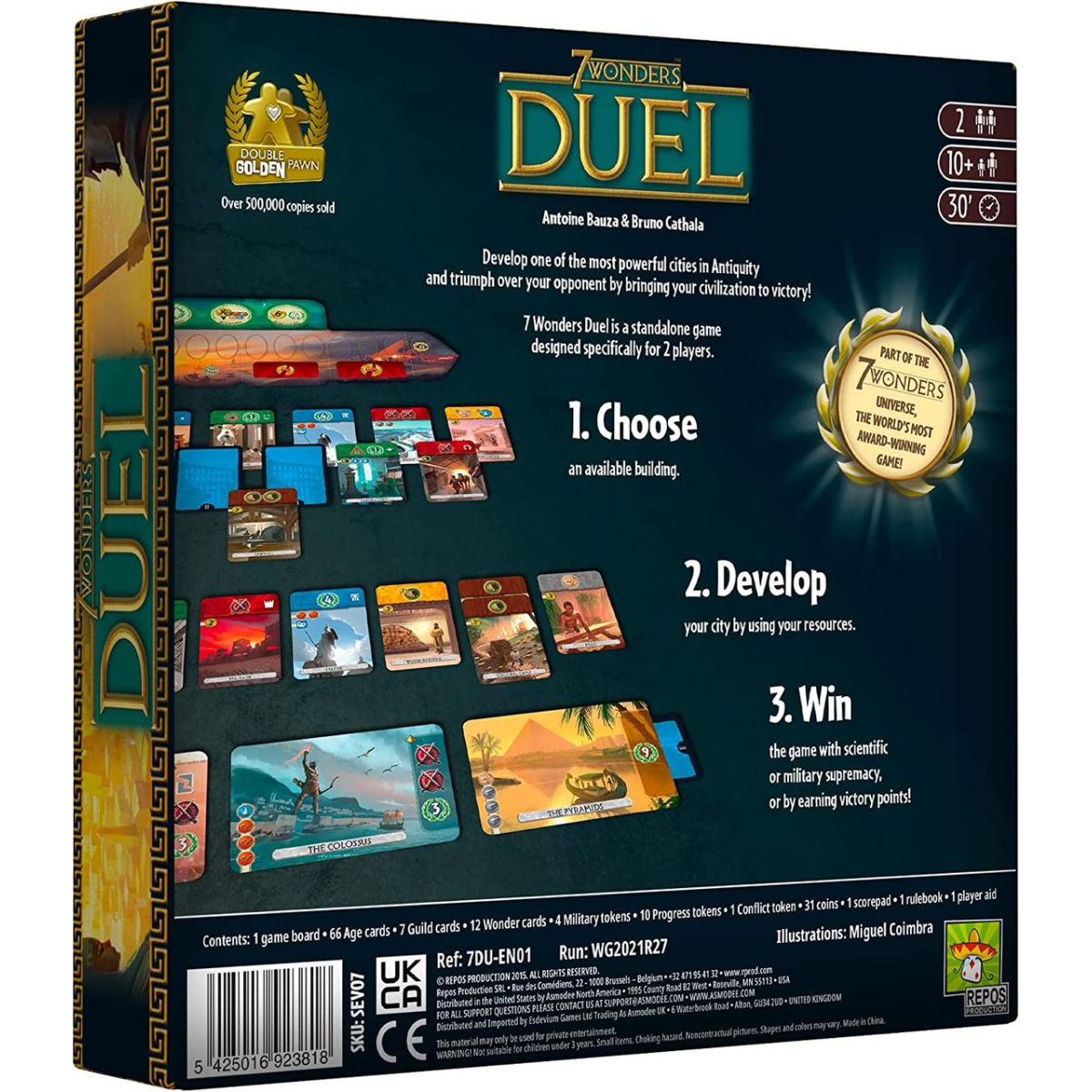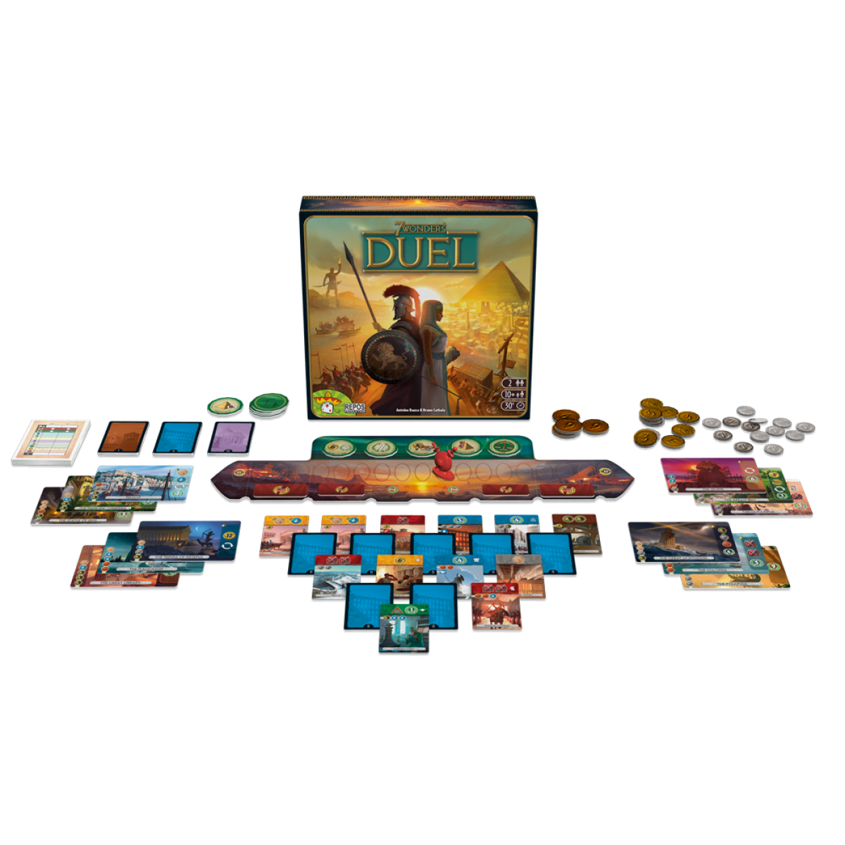 Гра 7 Wonders: Duel розрахована на двох гравців. Оформлення й атмосфера гри не змінилися — все та ж гра 7 Wonders, але механіка зазнала змін. Відчувається, що з усієї серії взято все найкраще та з усім цим ще попрацював Катала — жетони бонусів і картки з різними сорочками. Якщо ви грали в 7 Wonders, то компоненти вам будуть дуже знайомі. У компонентах нововведень трохи — жетони прогресу, поле для позначки військового переваги та фішка, яка покликана зазначати баланс військових сил.