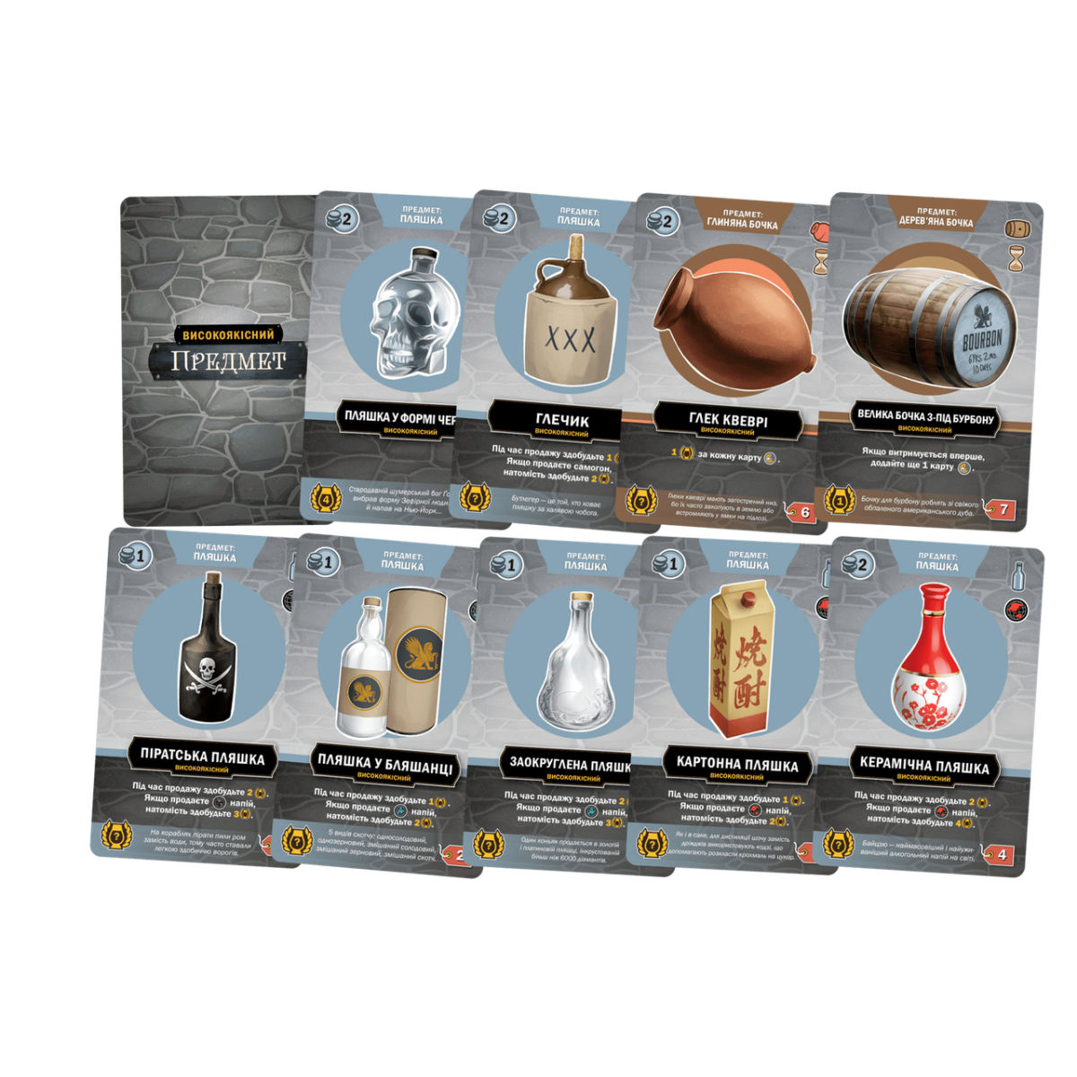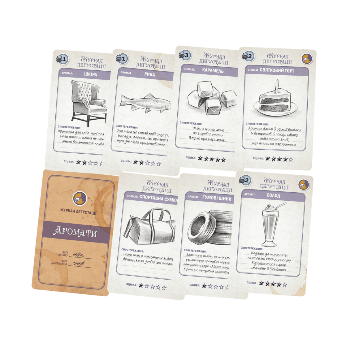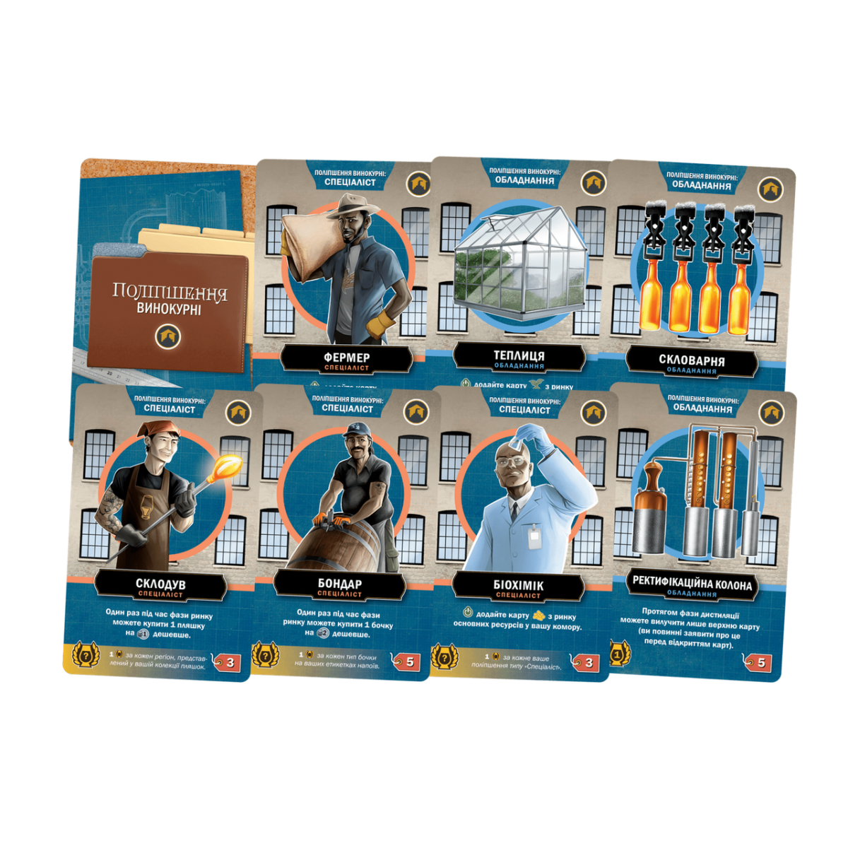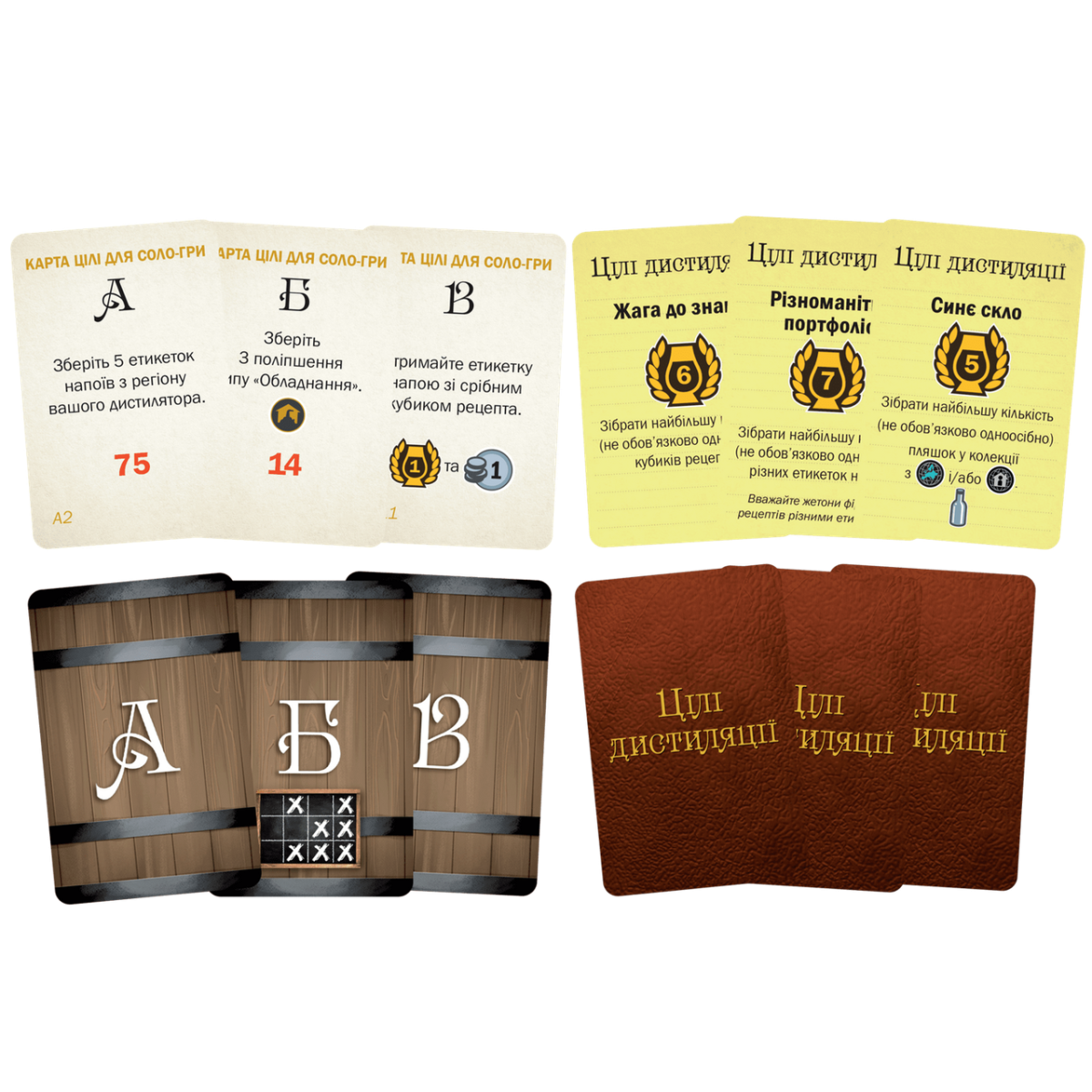Цікаво, що замість одного (центрального або часто взагалі єдиного) ігрового поля Distilled. Таємниці напоїв ми отримуємо кілька: планшети винокурень, рецептів, полиць, вантажівки та ринку, а ще багато карток, які розміщені в центрі столу в безпосередньому доступі для учасників.