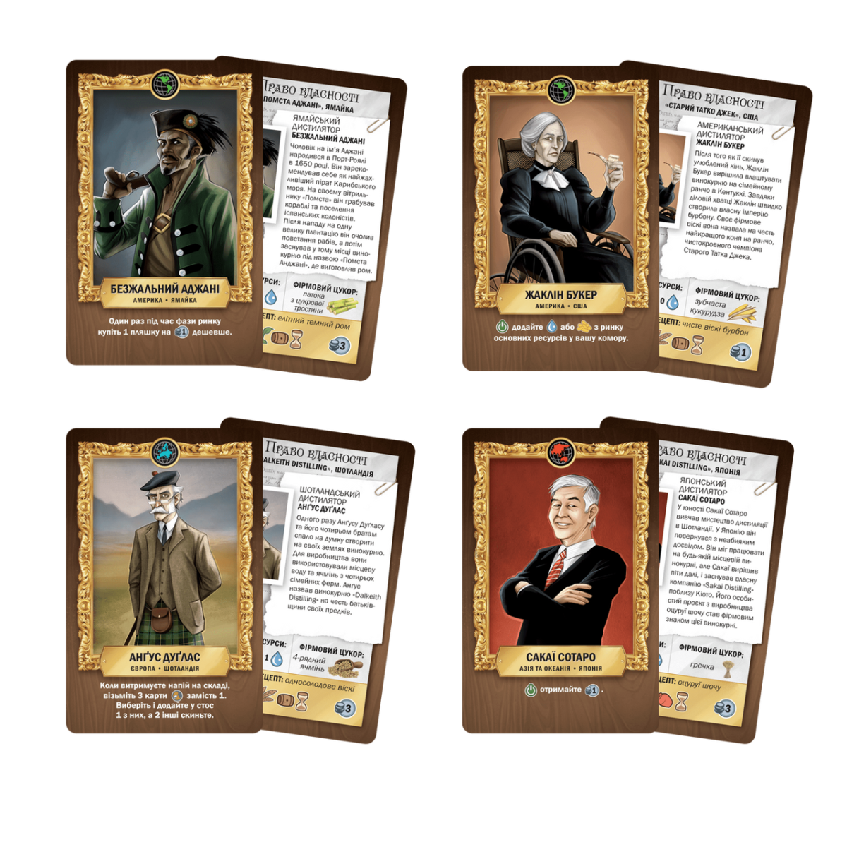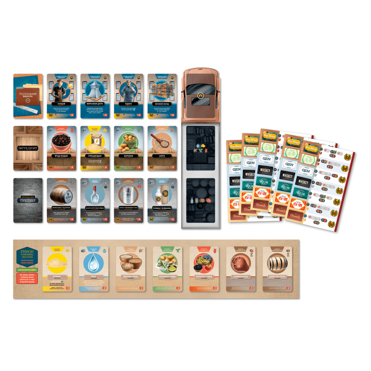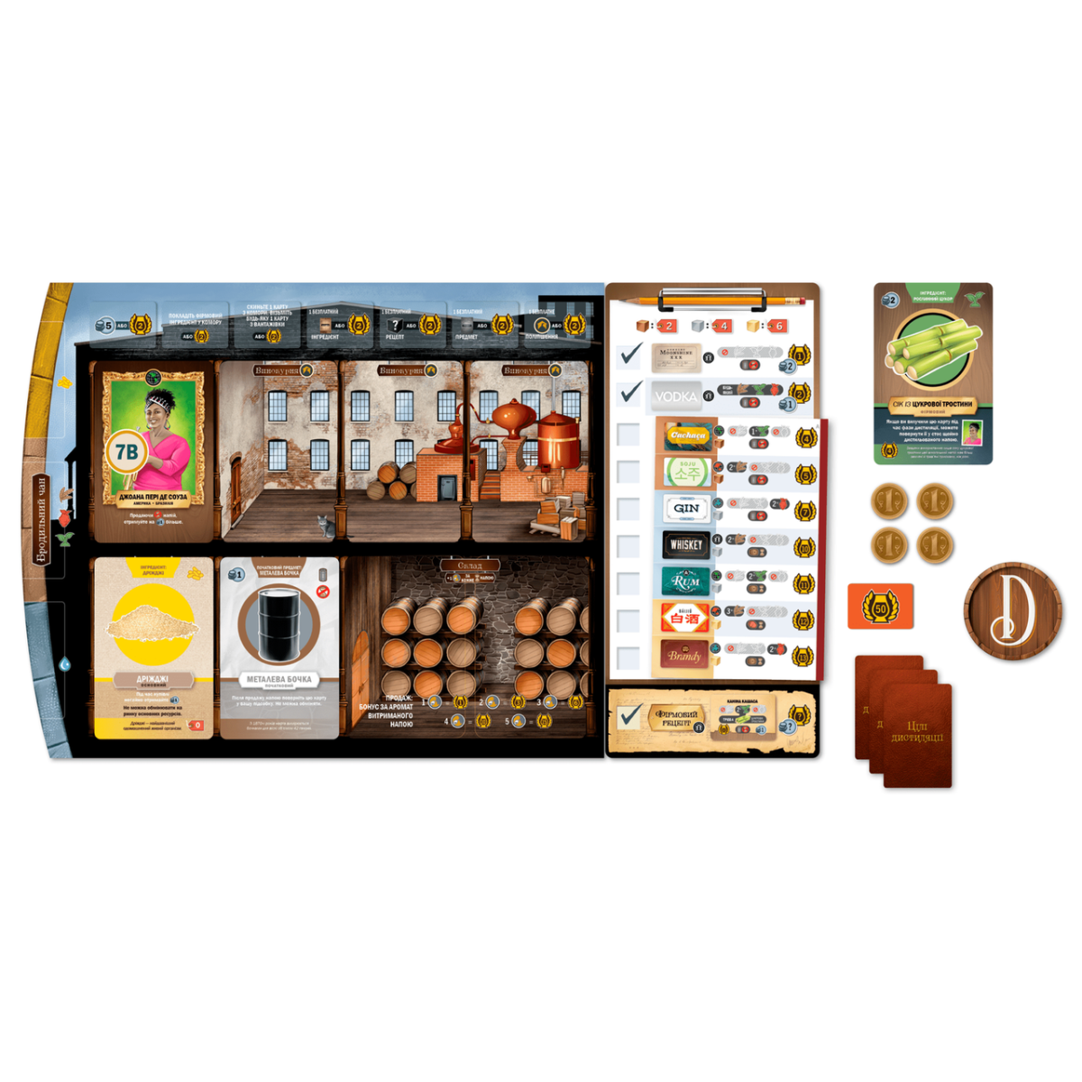 Цікаво, що замість одного (центрального або часто взагалі єдиного) ігрового поля Distilled. Таємниці напоїв ми отримуємо кілька: планшети винокурень, рецептів, полиць, вантажівки та ринку, а ще багато карток, які розміщені в центрі столу в безпосередньому доступі для учасників.