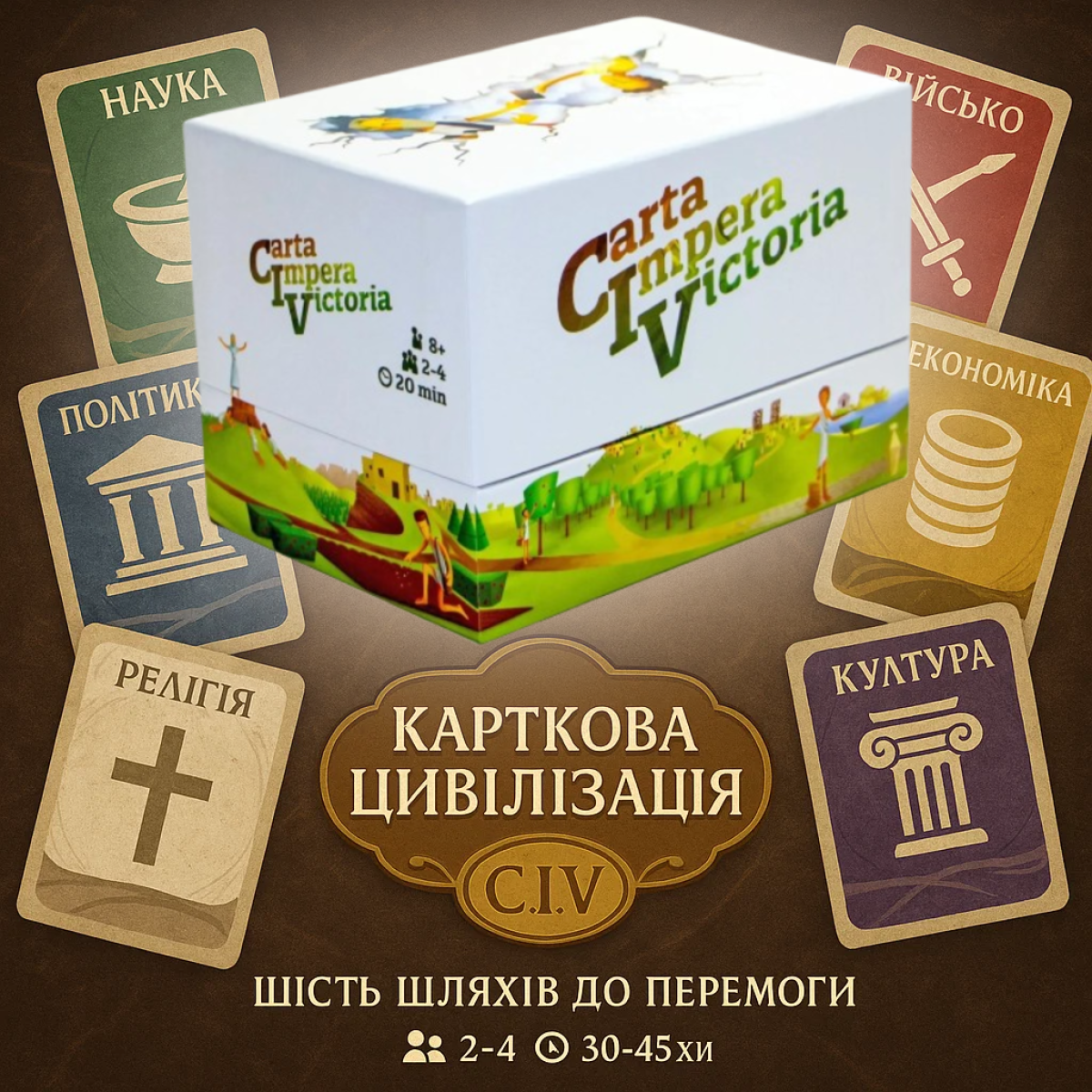 «CIV: Carta Impera Victoria» - швидка карткова гра про створення цивілізації. Гравці будуть піднімати з колін економіку, науку і культуру, поставляти релігійний опіум і качати мілітаристські м“язи. Карти діляться на три епохи. В останній епосі, якщо гра не закінчиться раніше, підуть карти утопії.