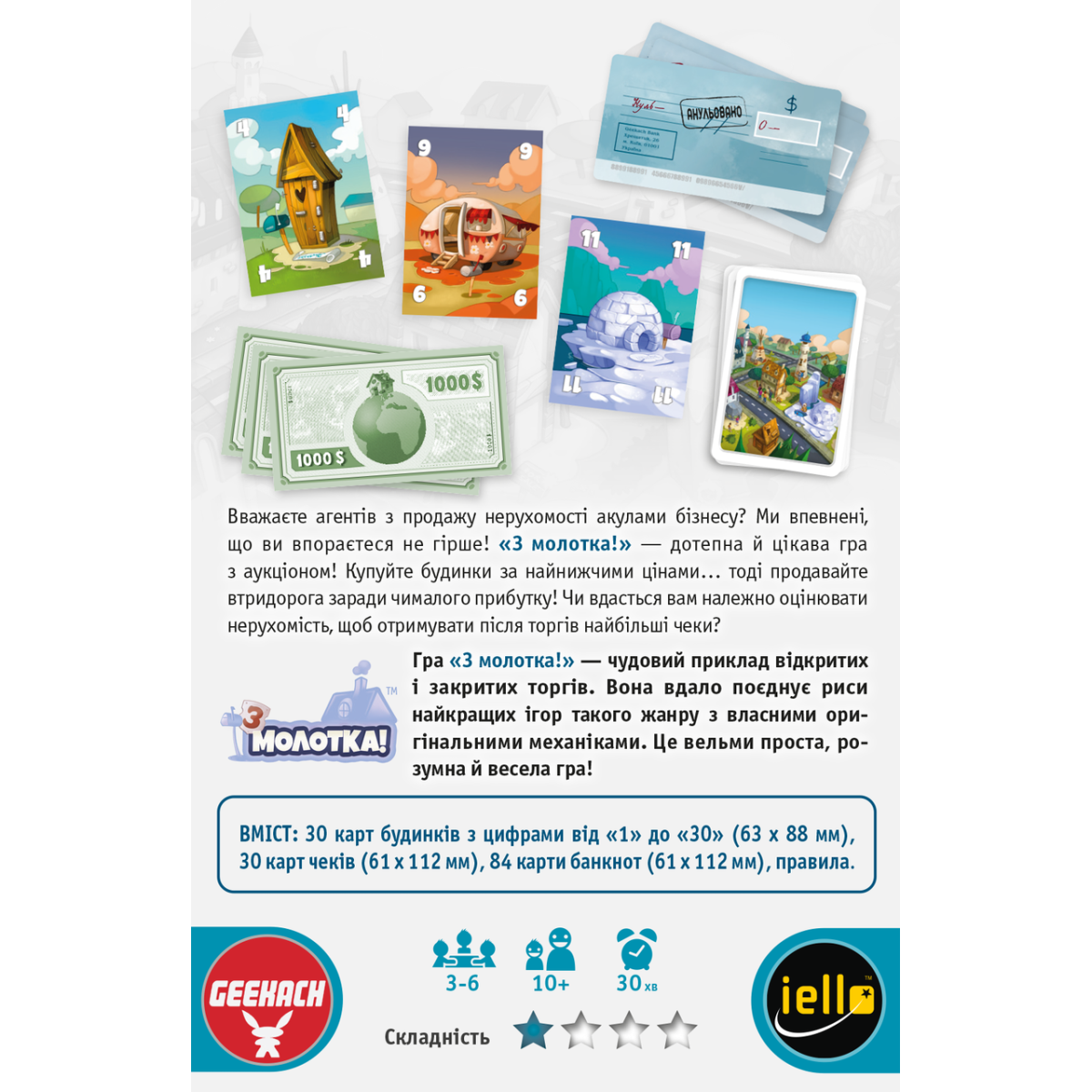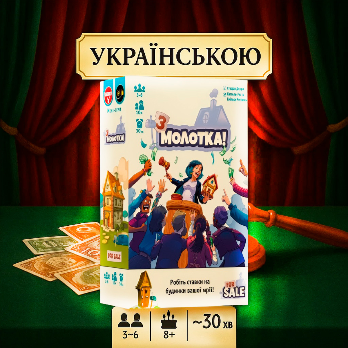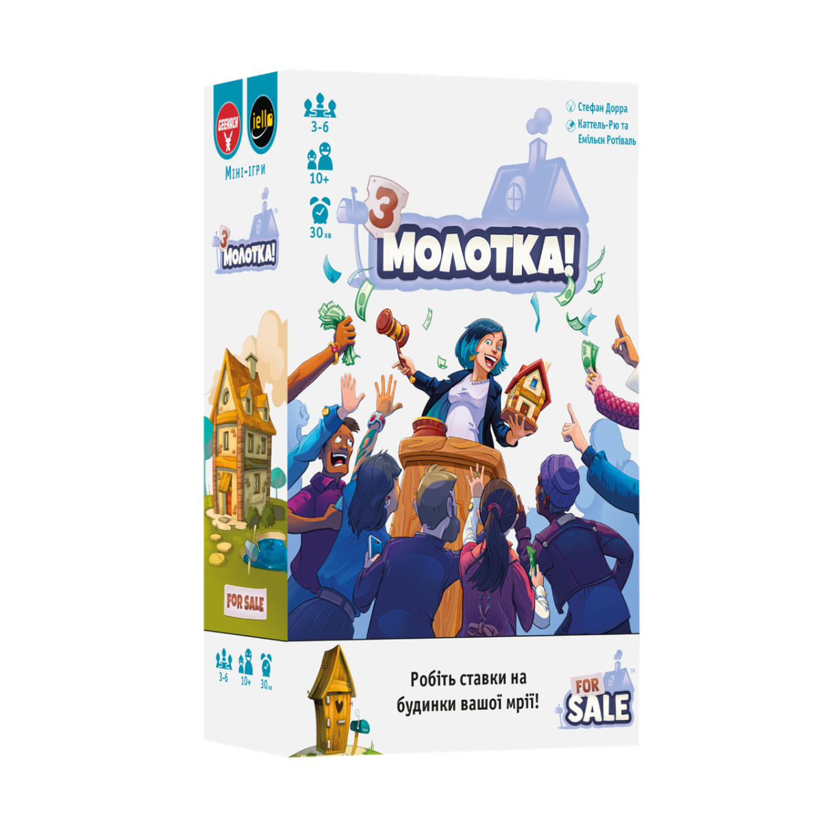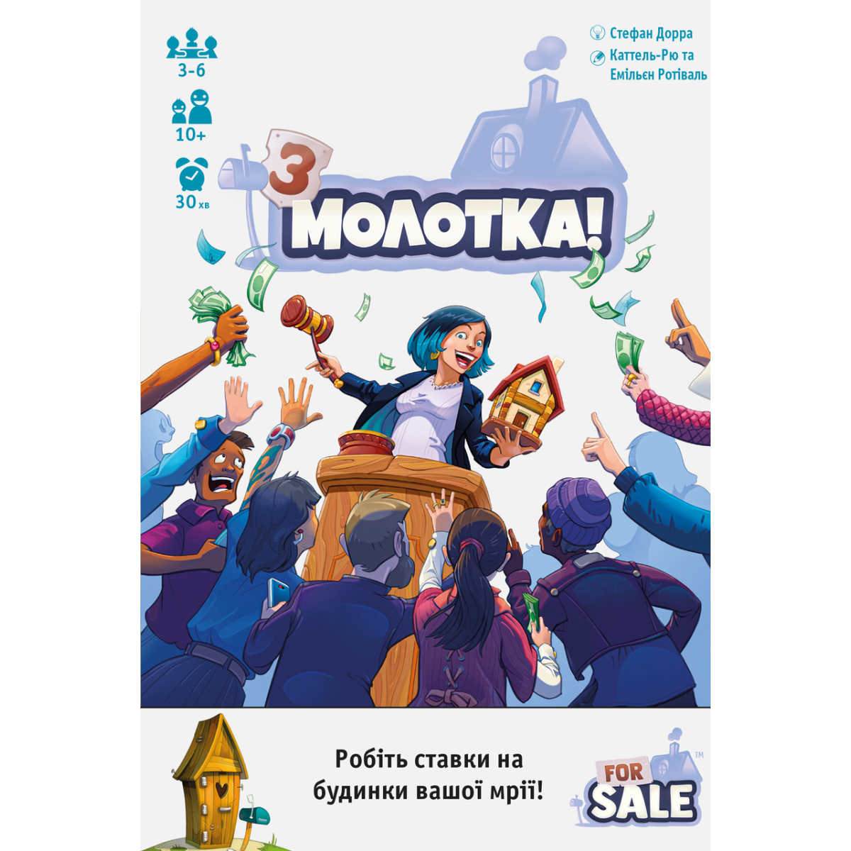 Опис: “Молотка“ (також відома як “For Sale“ або “Продано“) — це карткова настільна гра для 3-6 гравців, яка підійде як для сімейних вечорів, так і для зустрічей з друзями. Гра дозволяє учасникам спробувати свої сили в торгівлі нерухомістю, що робить її динамічною та захоплюючою. Основна мета гри — купити якомога більше нерухомості та заробити на цьому максимальну вигоду.
