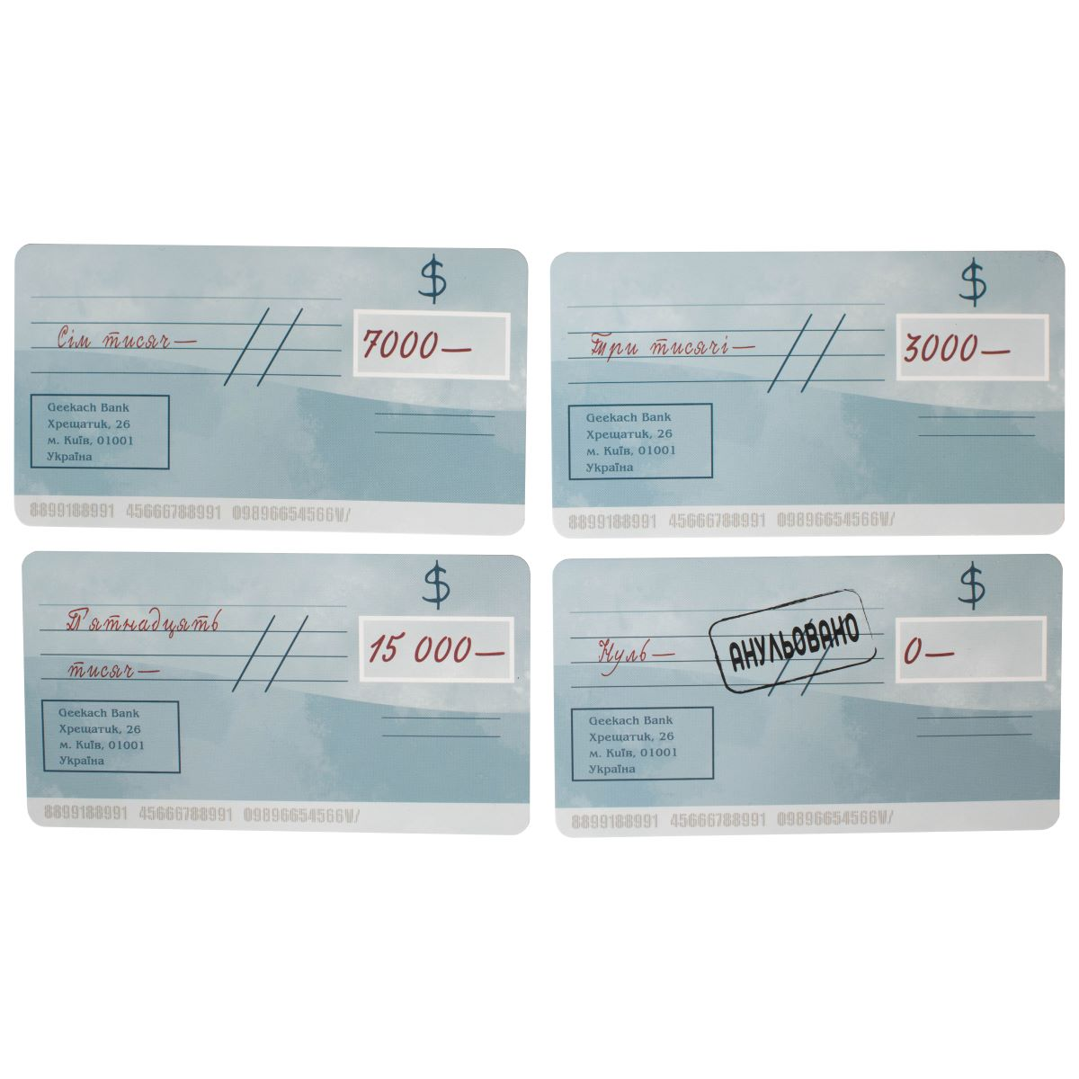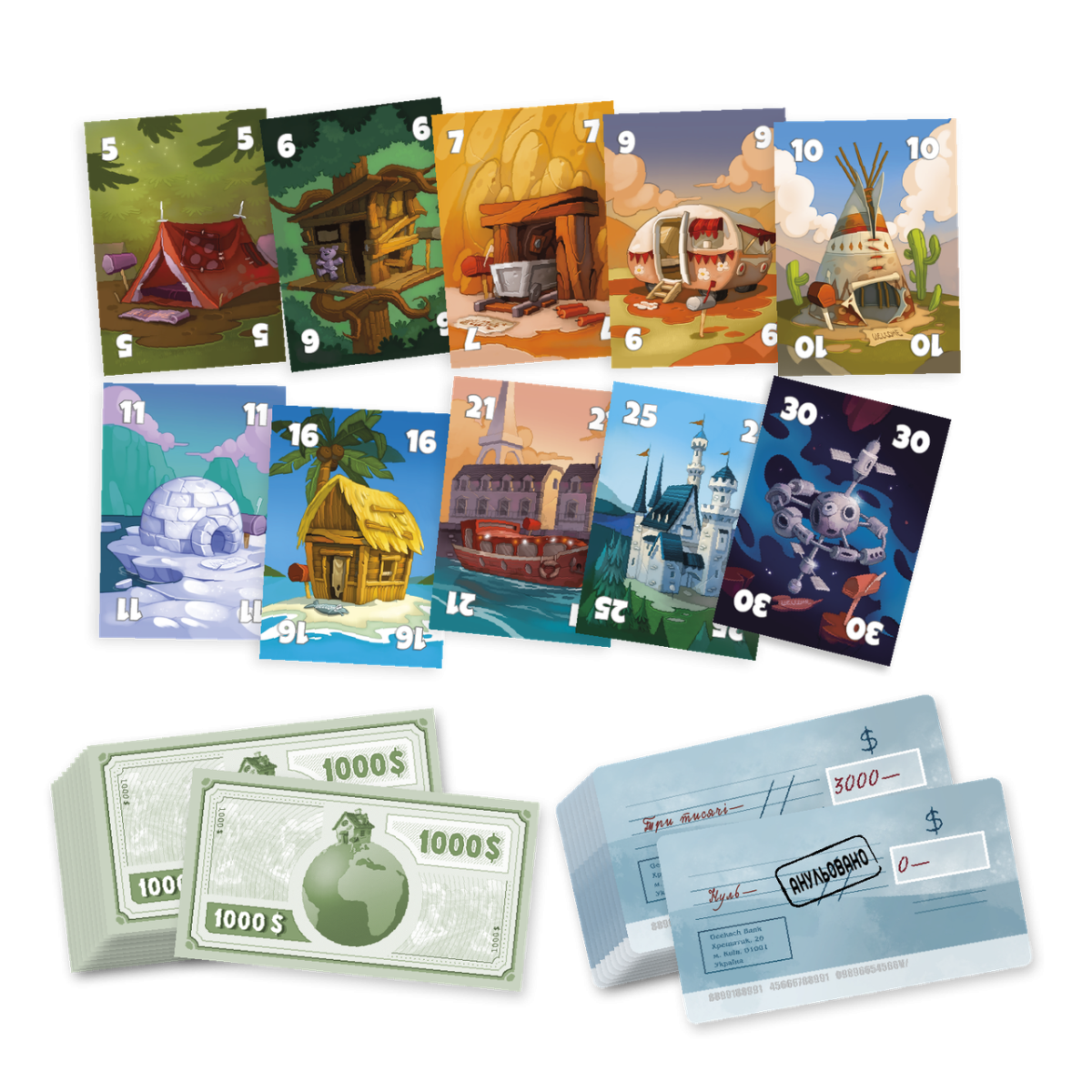Картки грошей — використовуються для здійснення покупок під час аукціонів. Картки мають різні номінали, що дозволяє гравцям стратегічно планувати свої витрати.