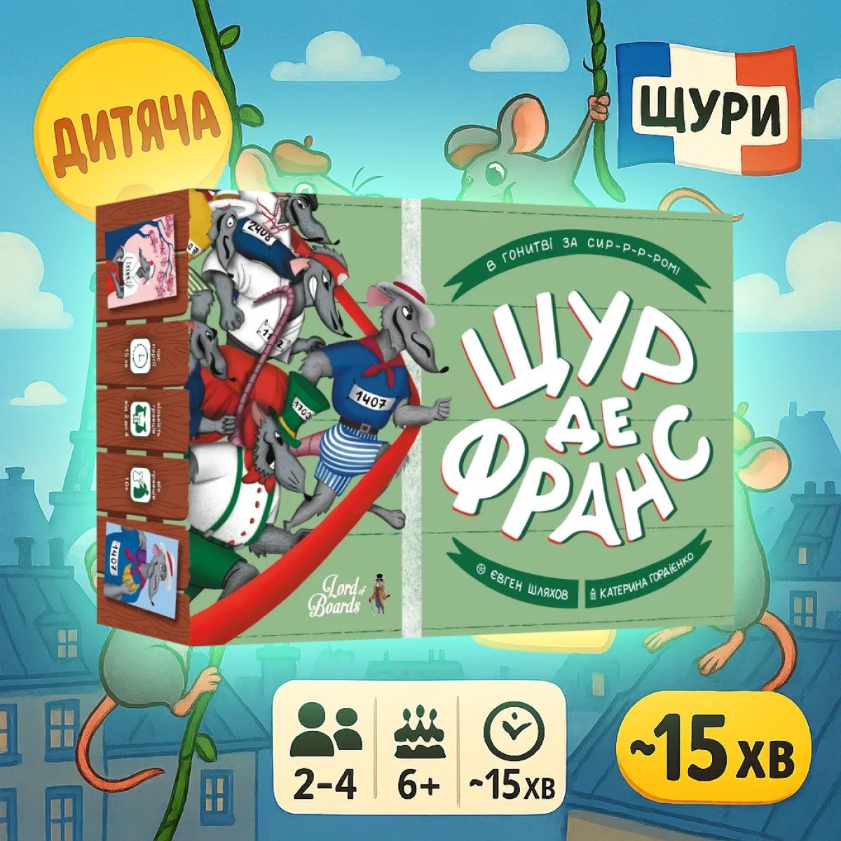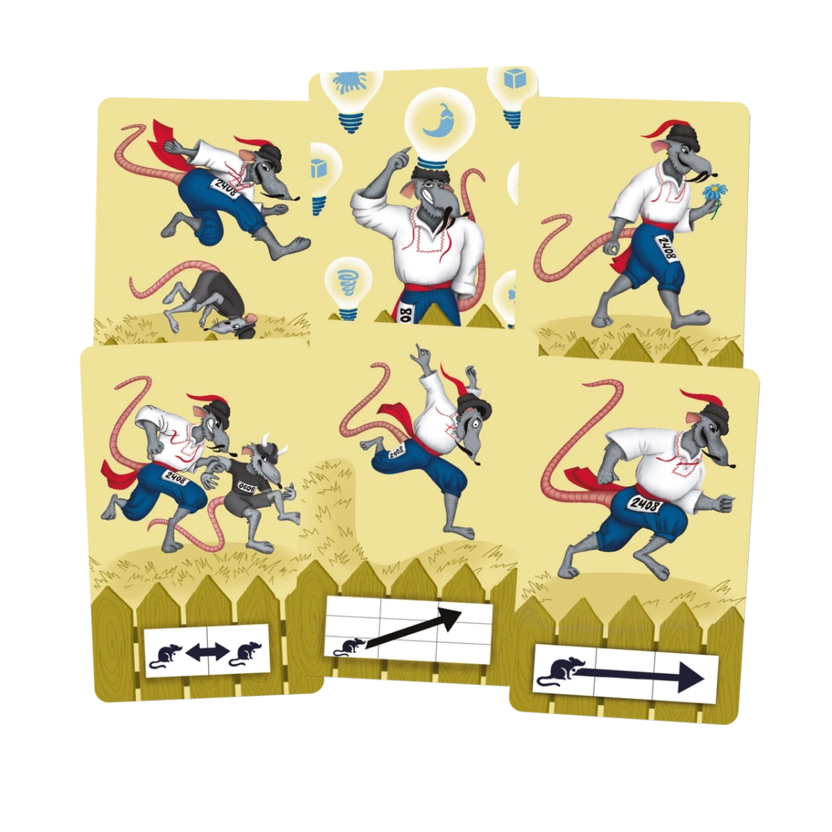 Настільна гра Щур де Франс — це новинка від українських авторів, у якій ви граєте за щурів-гонщиків і прагнете дістатися фінішу раніше, ніж ваші хитрі суперники. Але будьте обережні, адже вам потрібно проявити не тільки швидкість, а й спритність — попереду на вас чекає чимало перешкод. Гра розрахована на 2–4 гравців від 10 років і підійде для всієї родини.