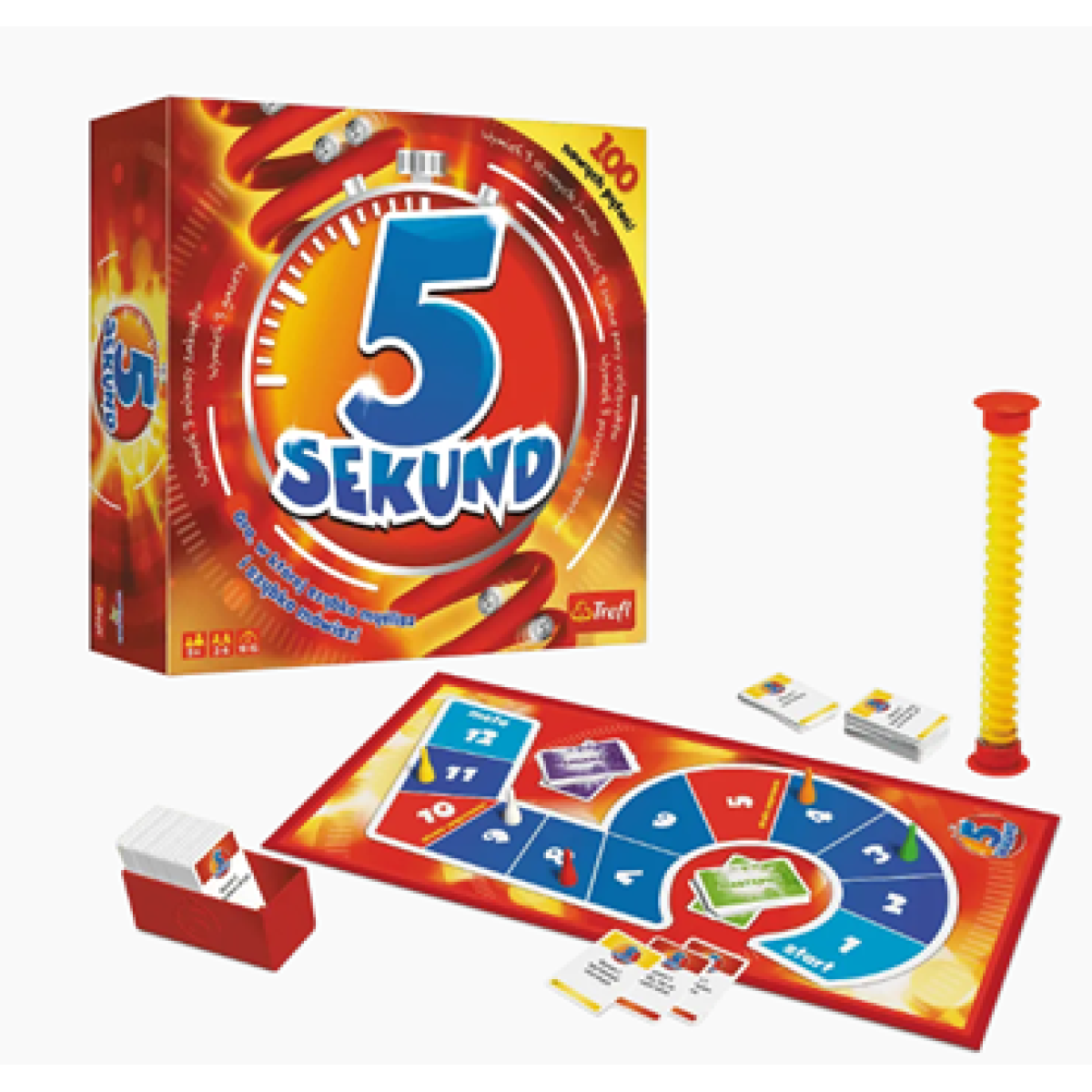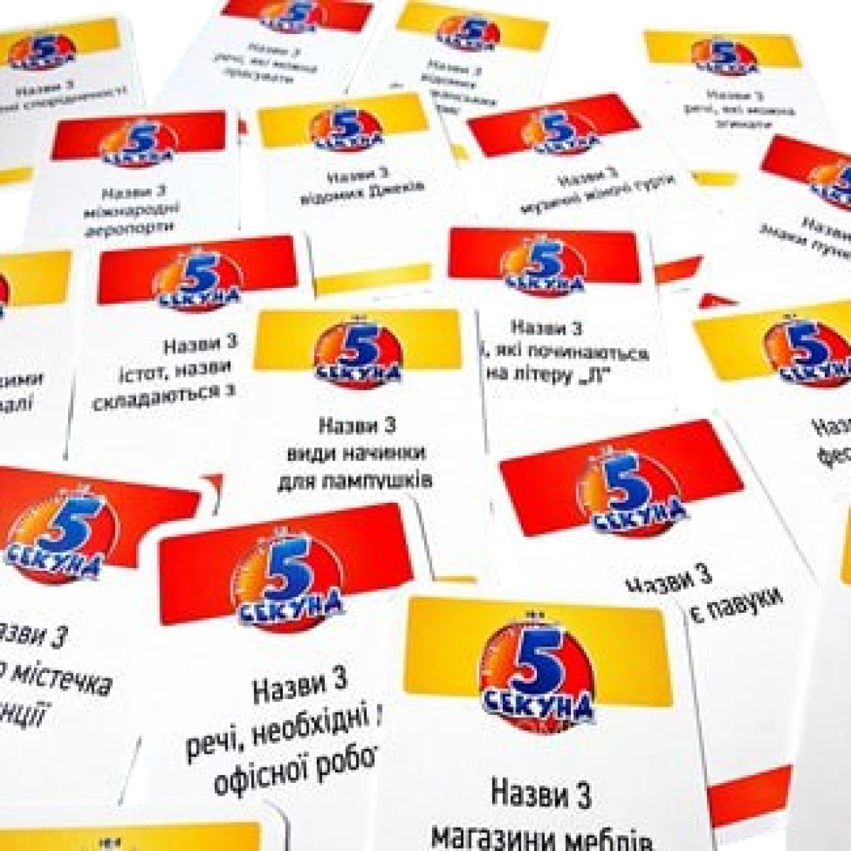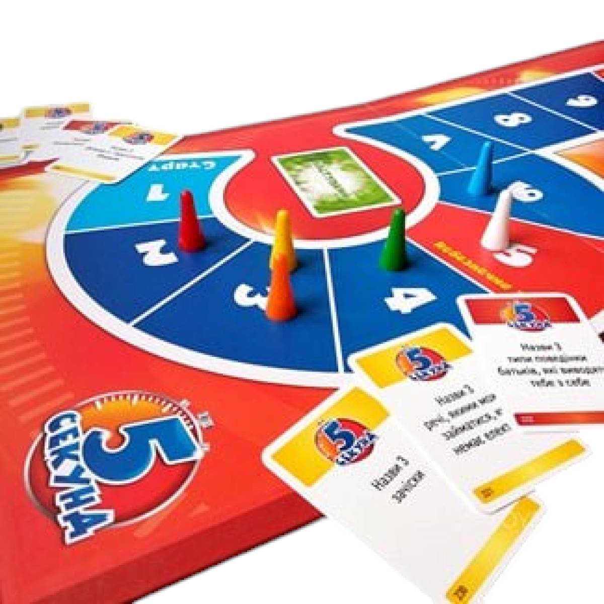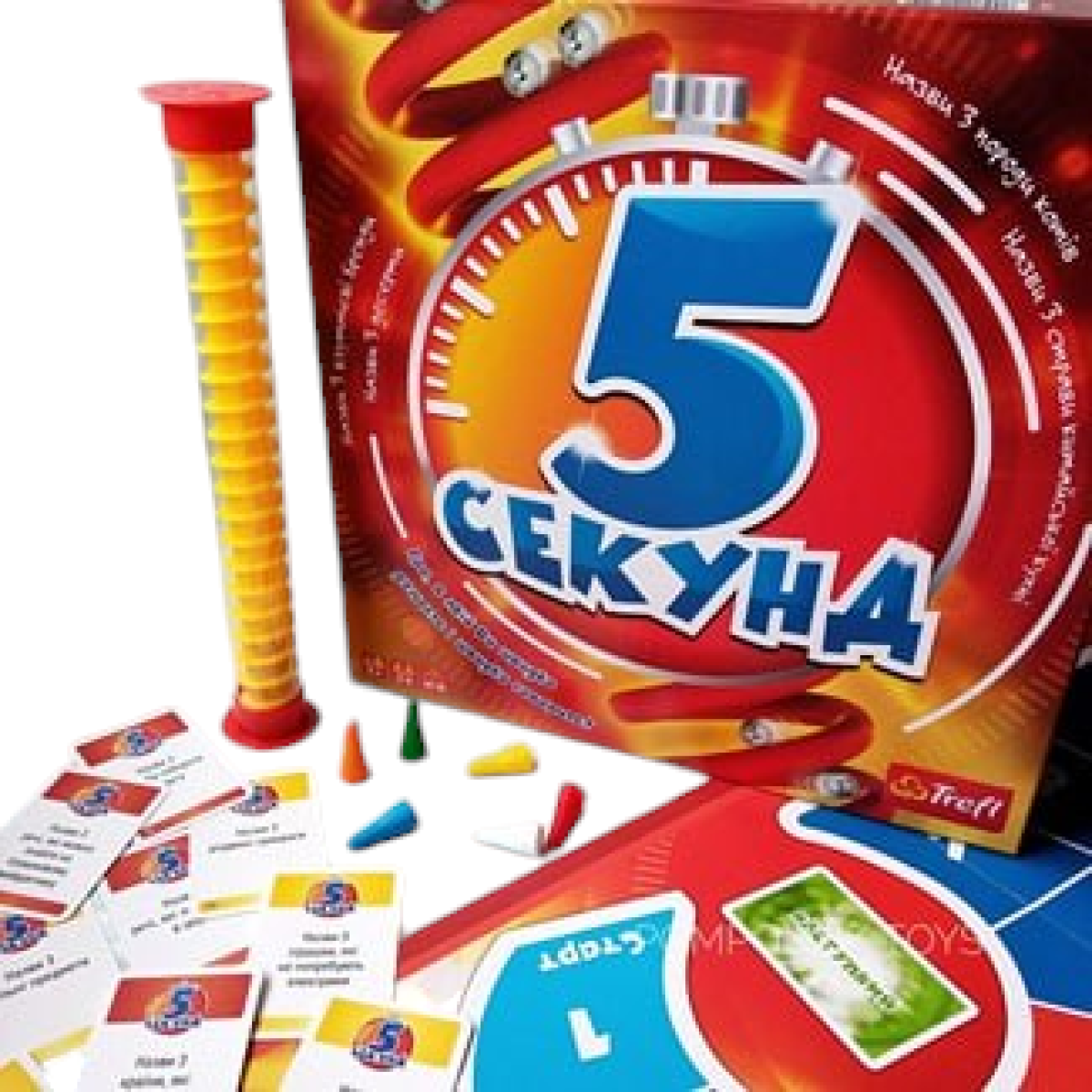 У 5 секунд все потрібно робити швидко - думати, відповідати, діяти. Перемагає той, хто дасть найбільше правильних відповідей і першим поставить свою фішку на “Фініш“. Гра однаково добре заходить і як сімейна, з дітьми і батьками, і як весела вікторина для дорослої компанії 3-6 чоловік, якщо компанія більше, можна розділитися на команди.