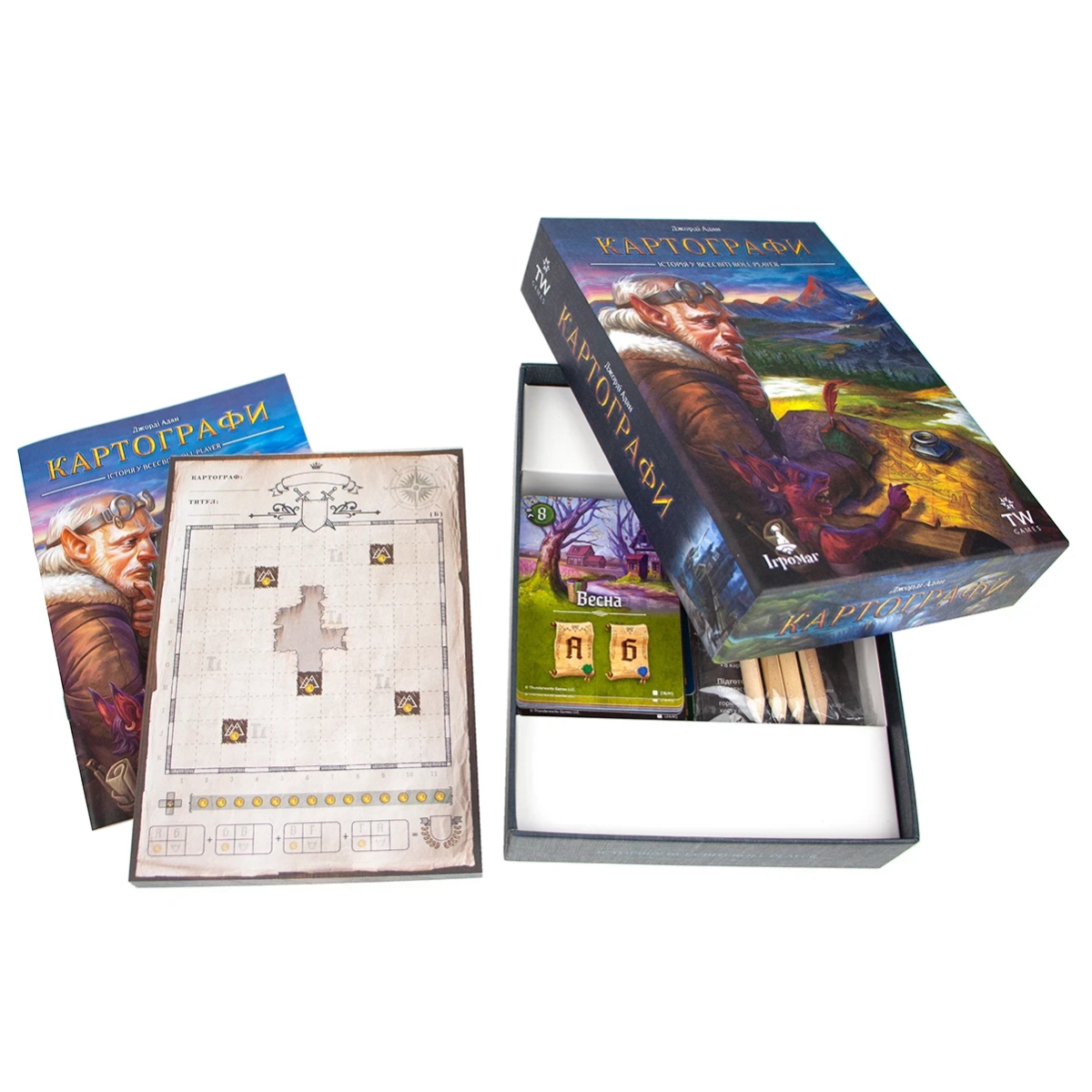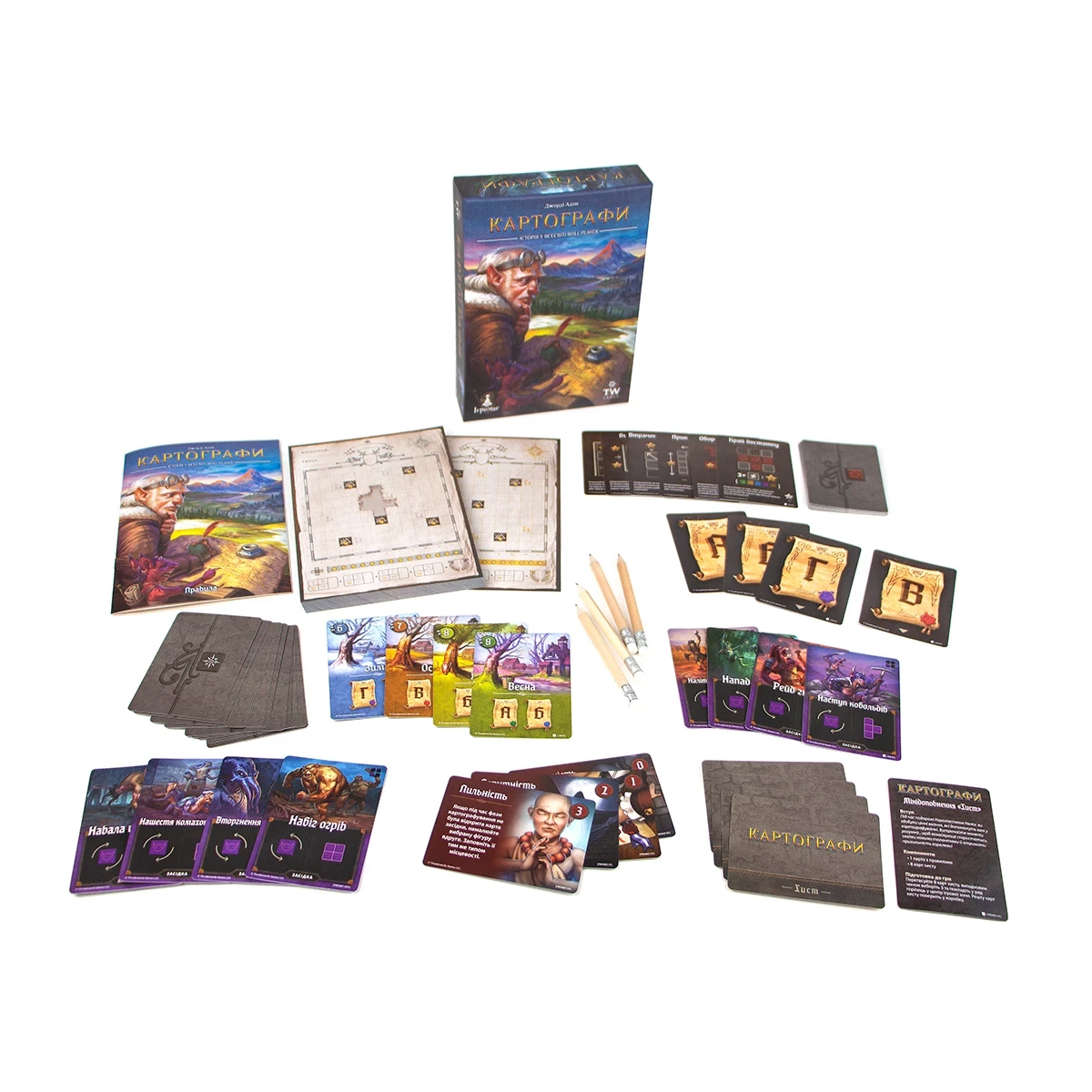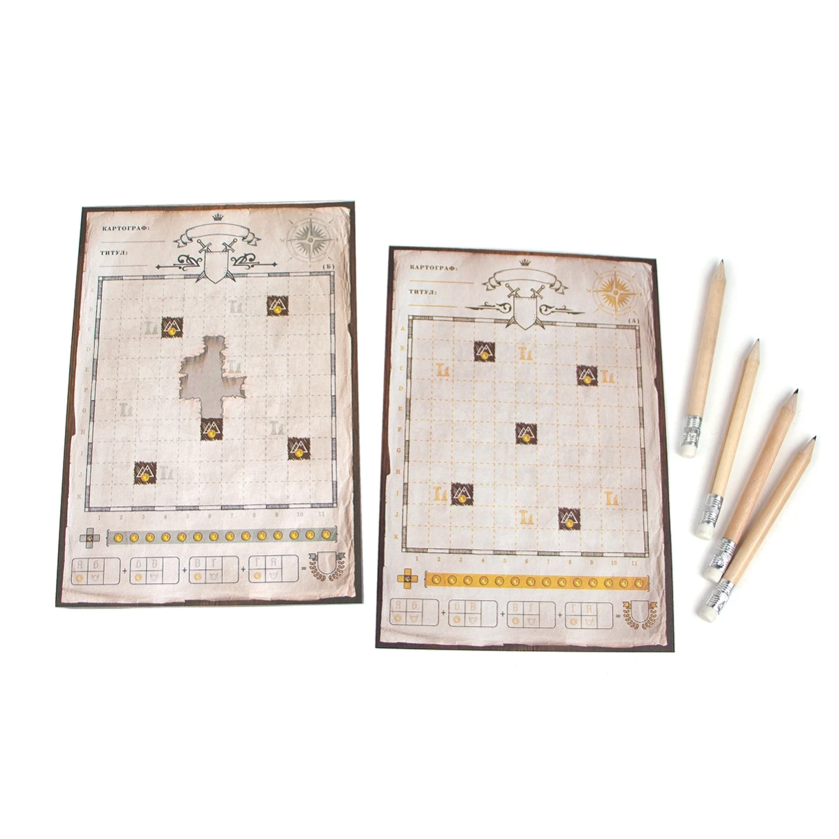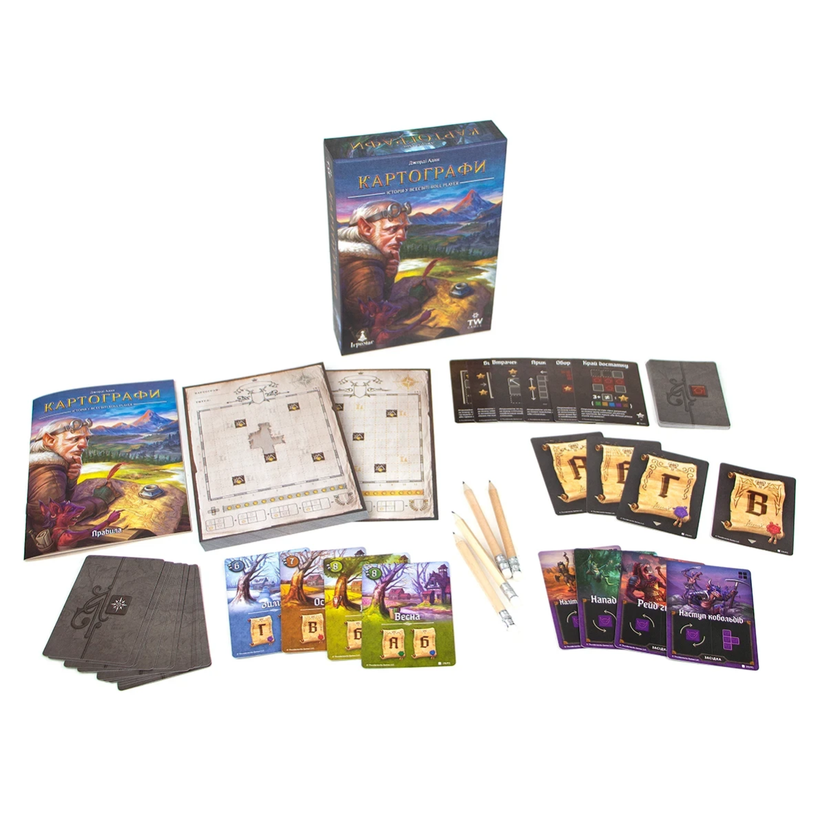 Картографи - сімейна настільна гра, в якій можна відправитися назустріч пригодам хоч поодинці, хоч величезною компанією! Цілий рік (умовний, звичайно ж) гравцям належить подорожувати по королівським землям, старанно замальовувати вивчені околиці в картографічні планшети, отримувати за свої старання золоті монети зі скарбниці, а також почесні зірки, в колекціонуванні яких і полягає головне завдання.