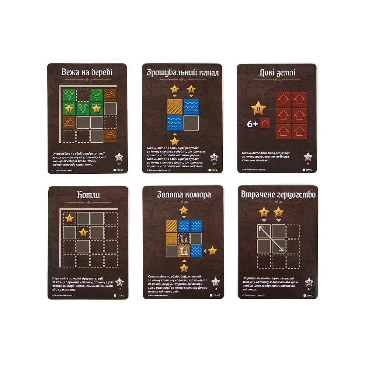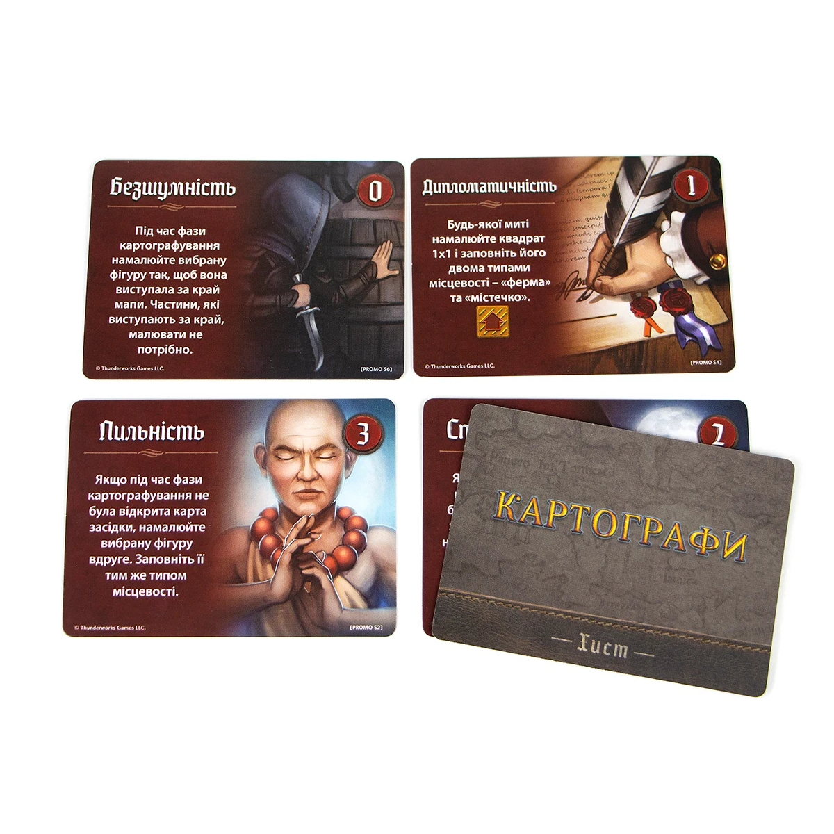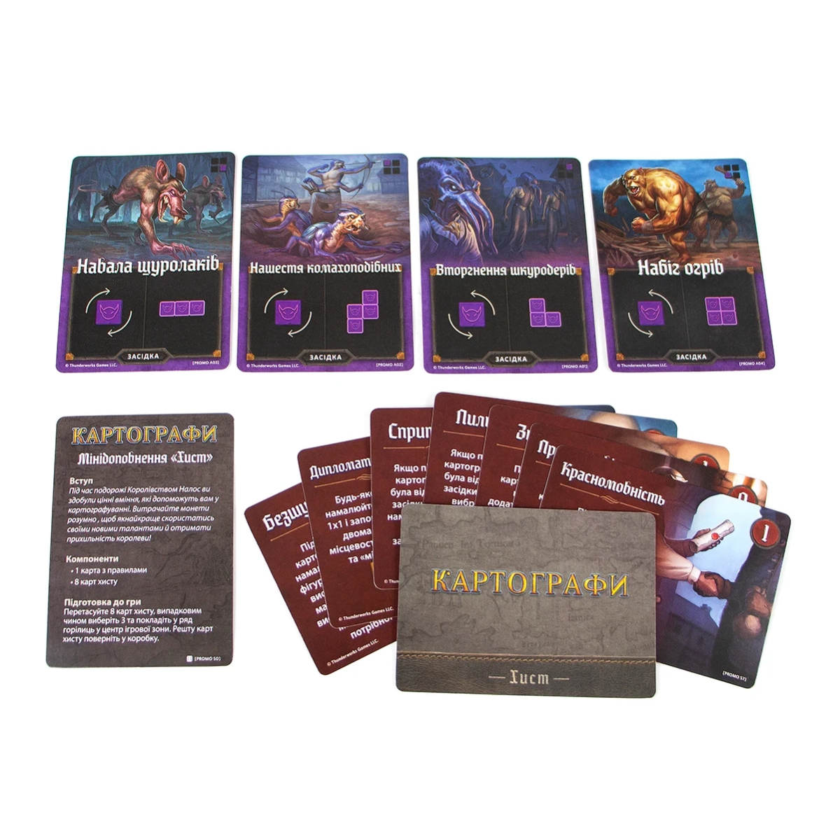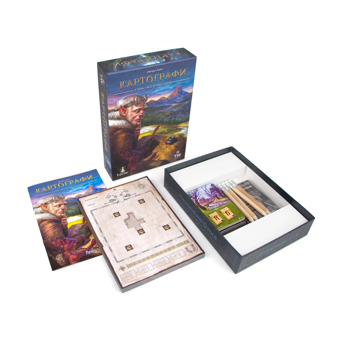Картографи - сімейна настільна гра, в якій можна відправитися назустріч пригодам хоч поодинці, хоч величезною компанією! Цілий рік (умовний, звичайно ж) гравцям належить подорожувати по королівським землям, старанно замальовувати вивчені околиці в картографічні планшети, отримувати за свої старання золоті монети зі скарбниці, а також почесні зірки, в колекціонуванні яких і полягає головне завдання.