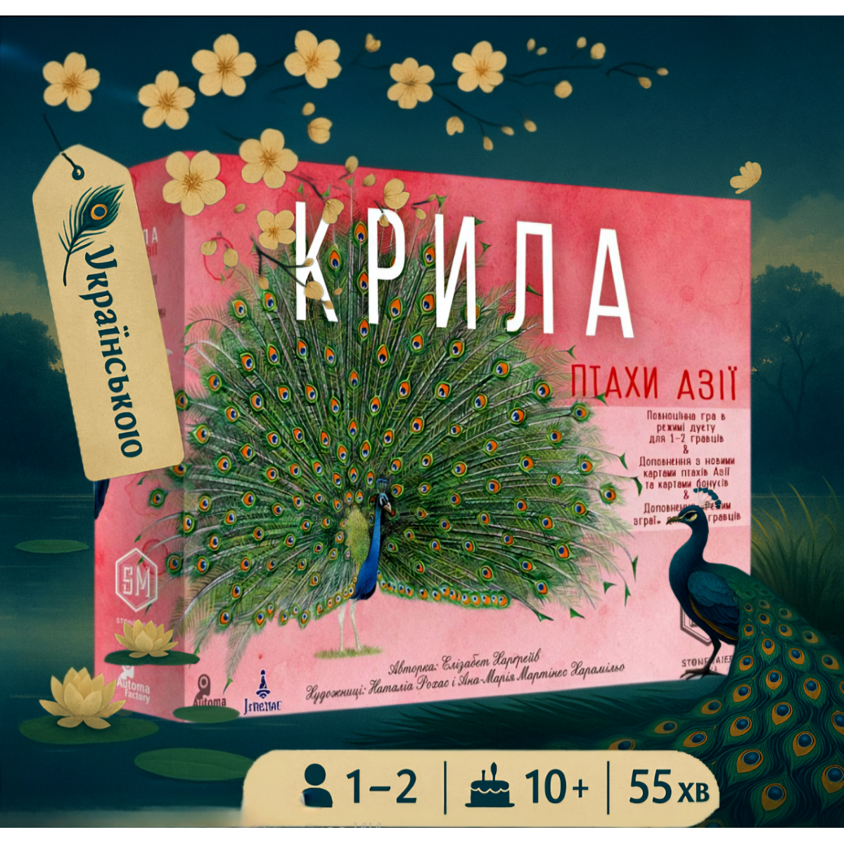 «Wingspan: Asia expansion» - третє доповнення для прекрасної сімейної гри «Крила». Присвячене яскравим птахам Азії, яких там проживає понад 2800 видів. У комплекті нові карти птахів і бонусів, планшети заповідників, мапа для спеціальної дуетної гри, планшет цілей раундів для режиму зграї, зручний лічильник порядку ходу, поле-годівниця, різноманітні жетони, кубики та фішки, фігурки яєць.