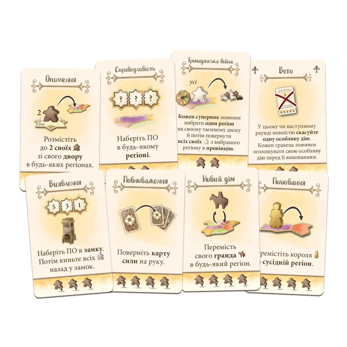 По-третє, ходимо: запрошуємо лицарів до свого двору, використовуємо одну з отих самих попередньо відкритих карт дій, виконуючи обидві в довільному порядку, розміщуємо наші кольорові кубики кабальєро на полі й, врешті, можемо виконати особливу дію.