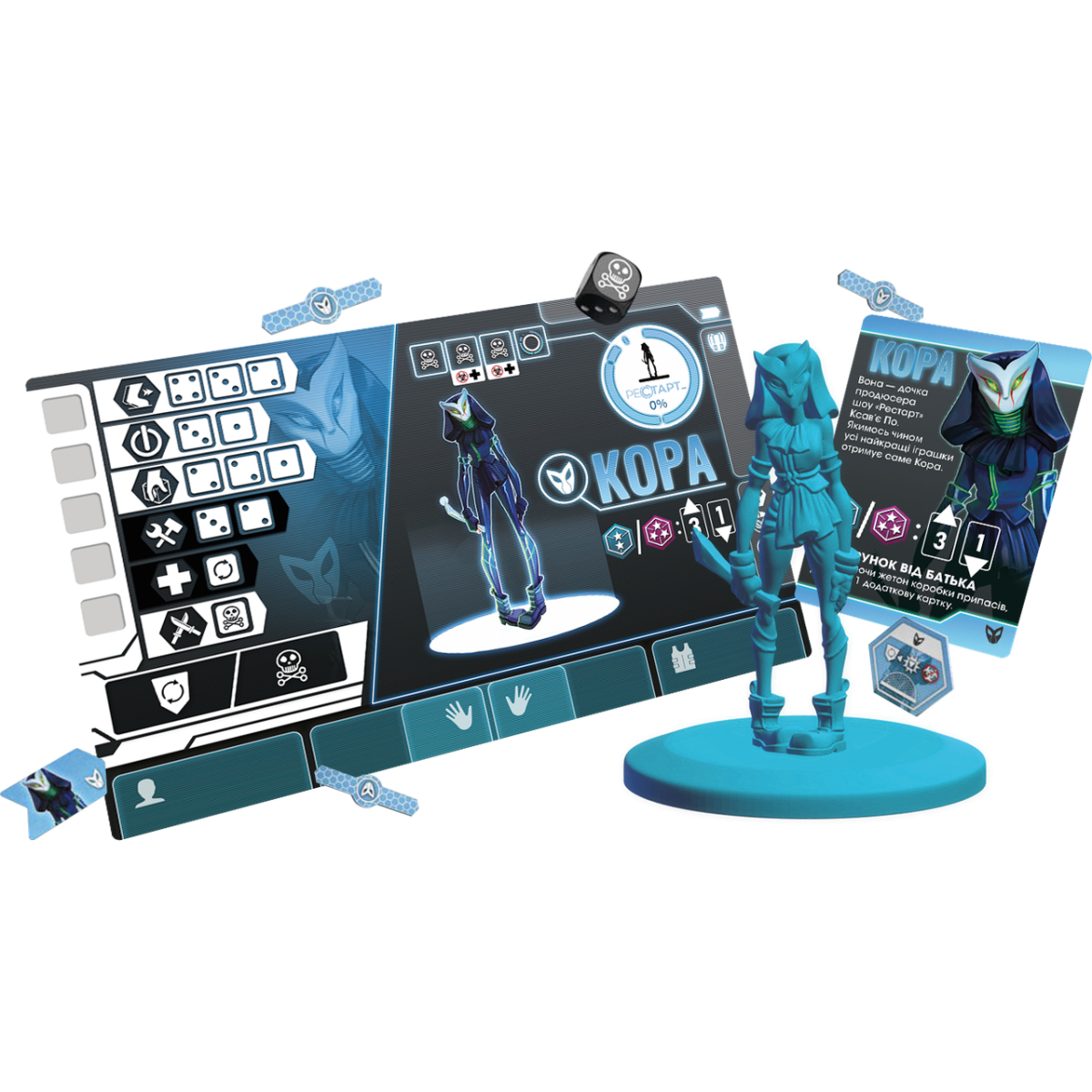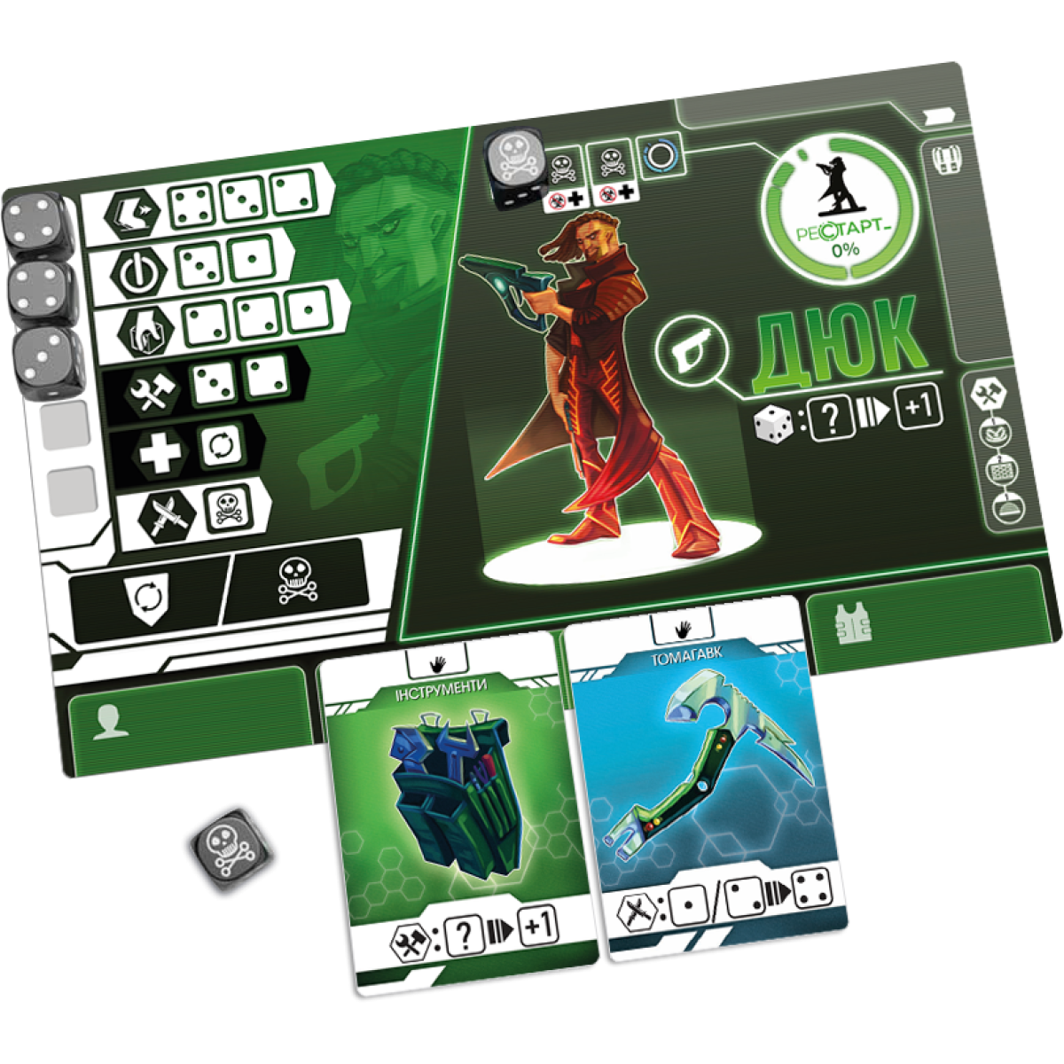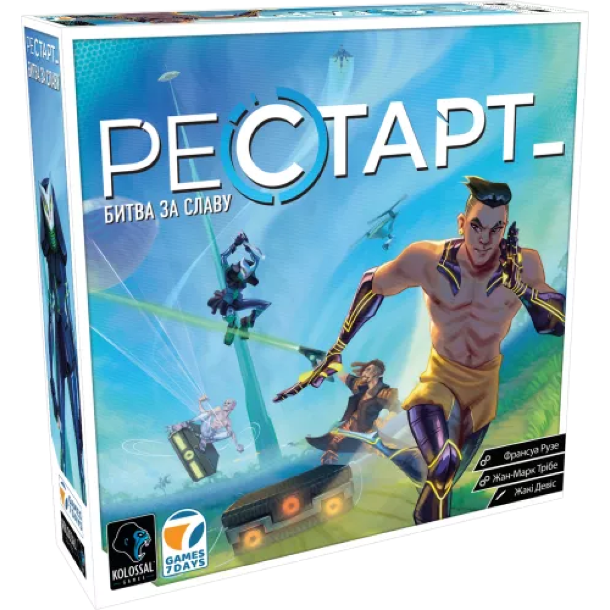 Опис: “Рестарт“ (Reload) — це стратегічна настільна гра з елементами бойовика, в якій гравці занурюються у жорстоке і конкурентне змагання на острові. Події гри розгортаються у майбутньому, де мегакорпорації влаштовують змагання з участю найманців. Гравці виступають у ролі бійців, які борються за славу, виживання та ресурси. Основне завдання — перемогти всіх супротивників, використовуючи тактику, навички та різноманітну зброю, яку можна знайти або створити на ігровому полі.