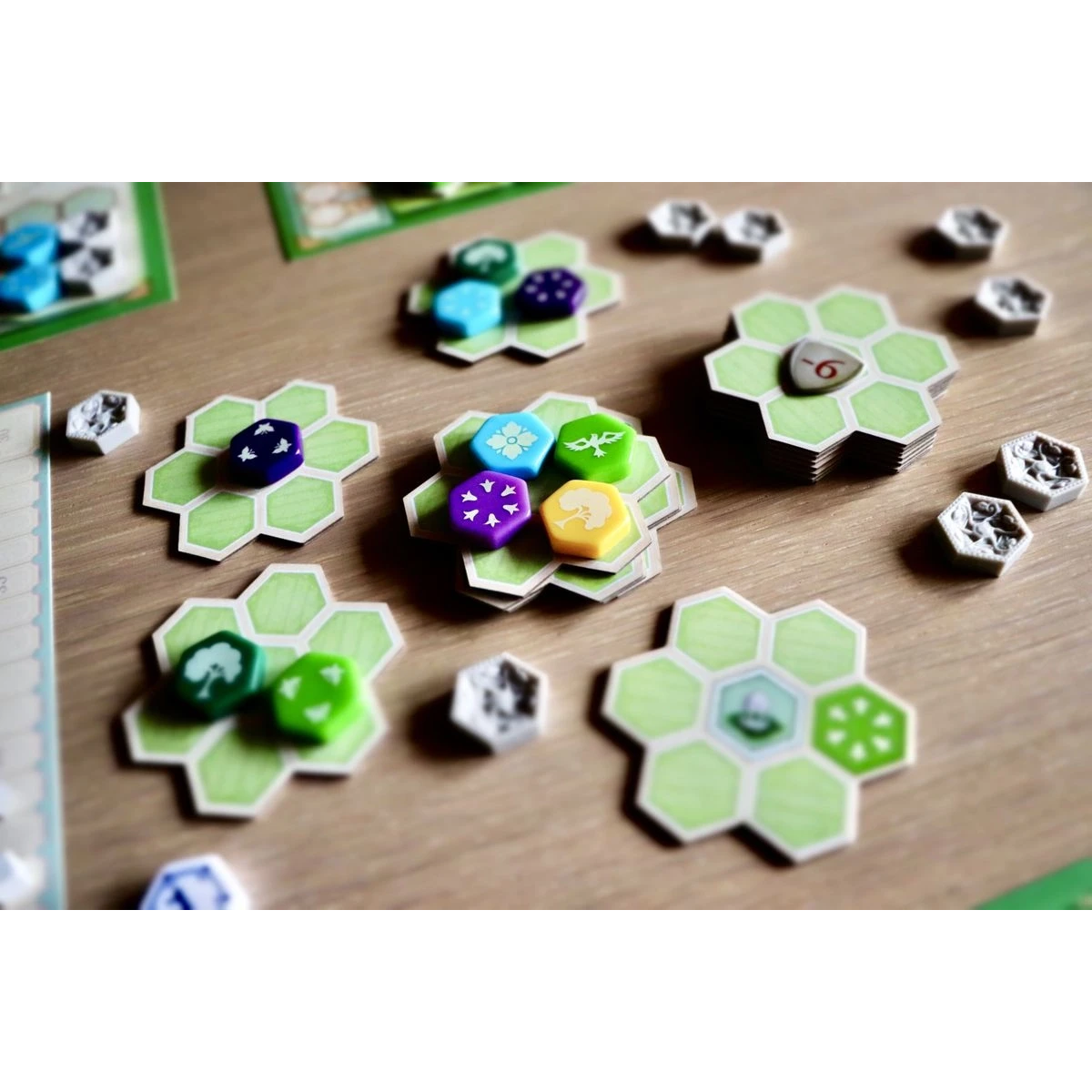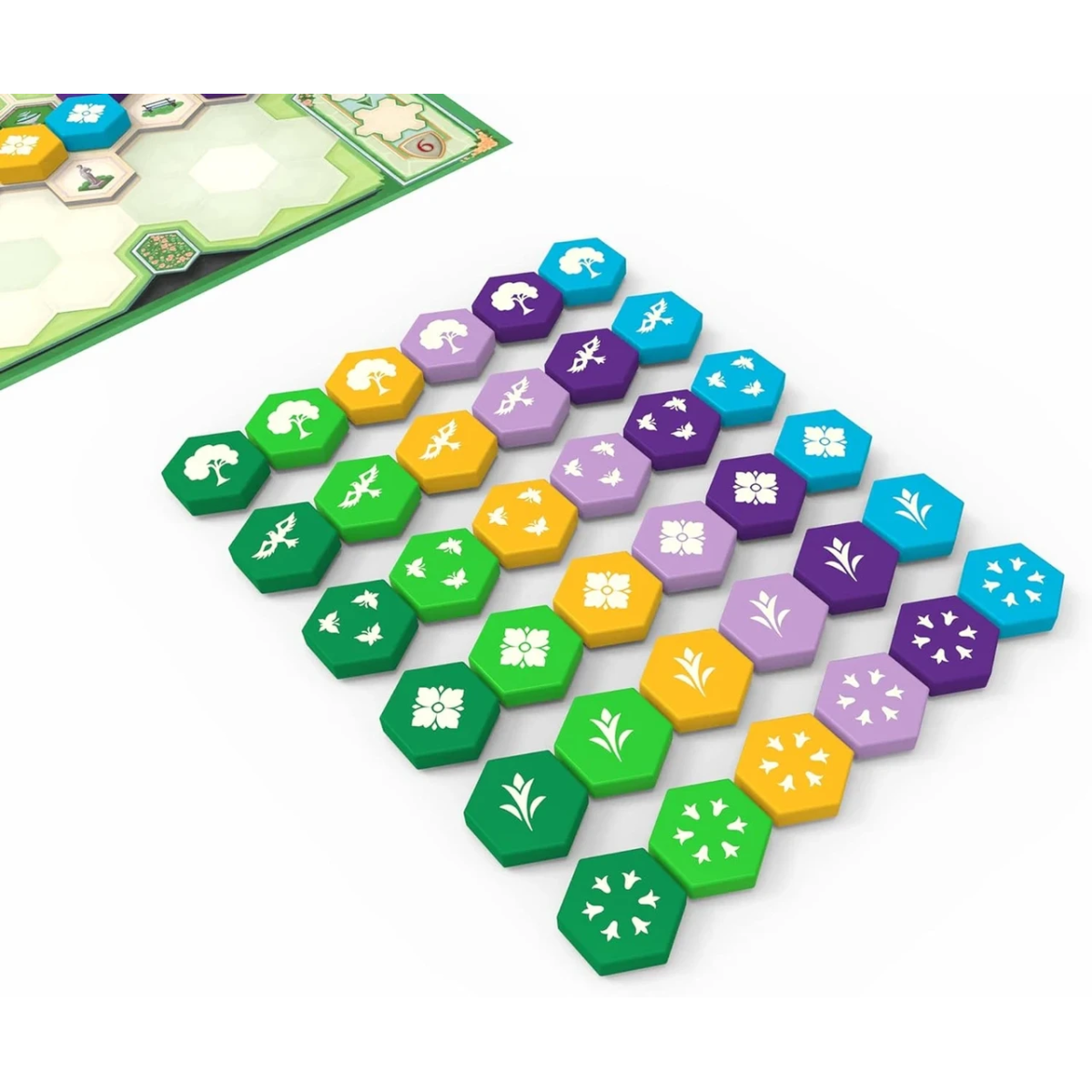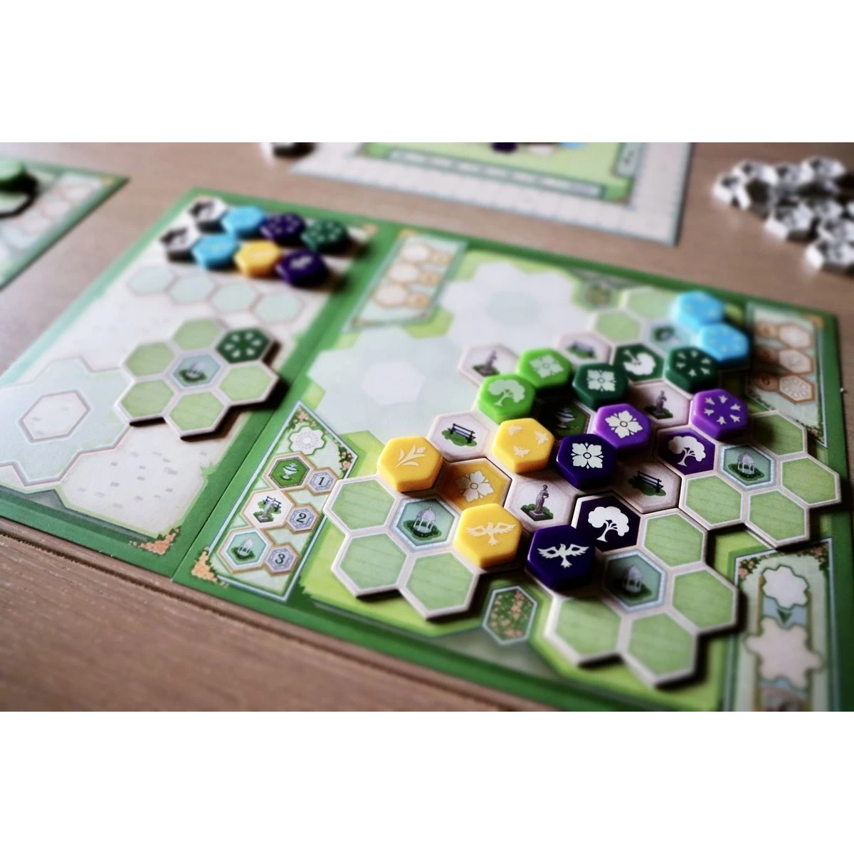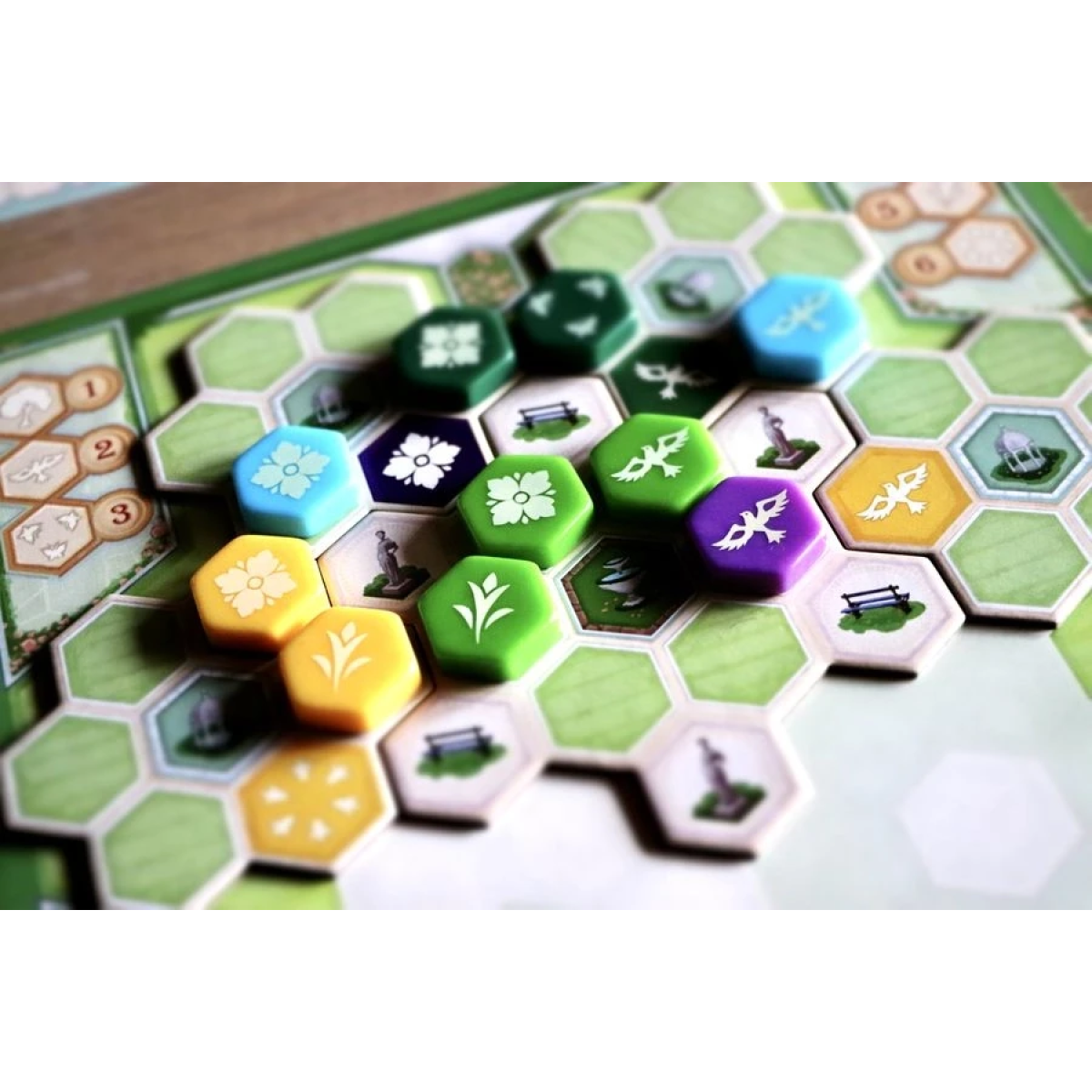 «Сад королеви» – це самостійна гра з механіками плануванням та драфту. Мета гри – за чотири раунди створити надзвичайної краси сад, комбінуючи кольори та візерунки, у кожного з яких є своя цінність. Гравці будуватимуть алеї саду з гексових жетонів, а наприкінці кожного раунду підраховуватимуть бали за викладені на них плитки.