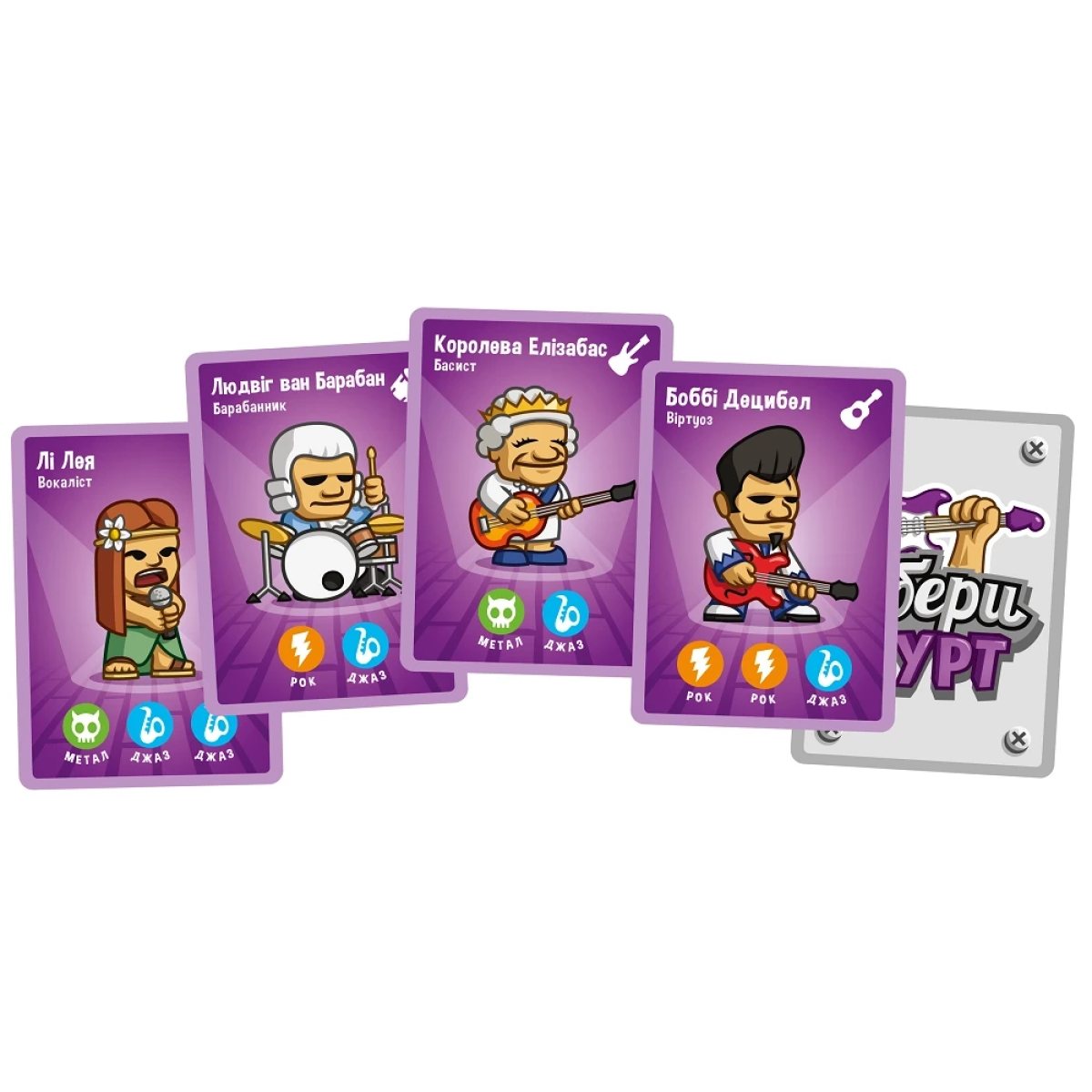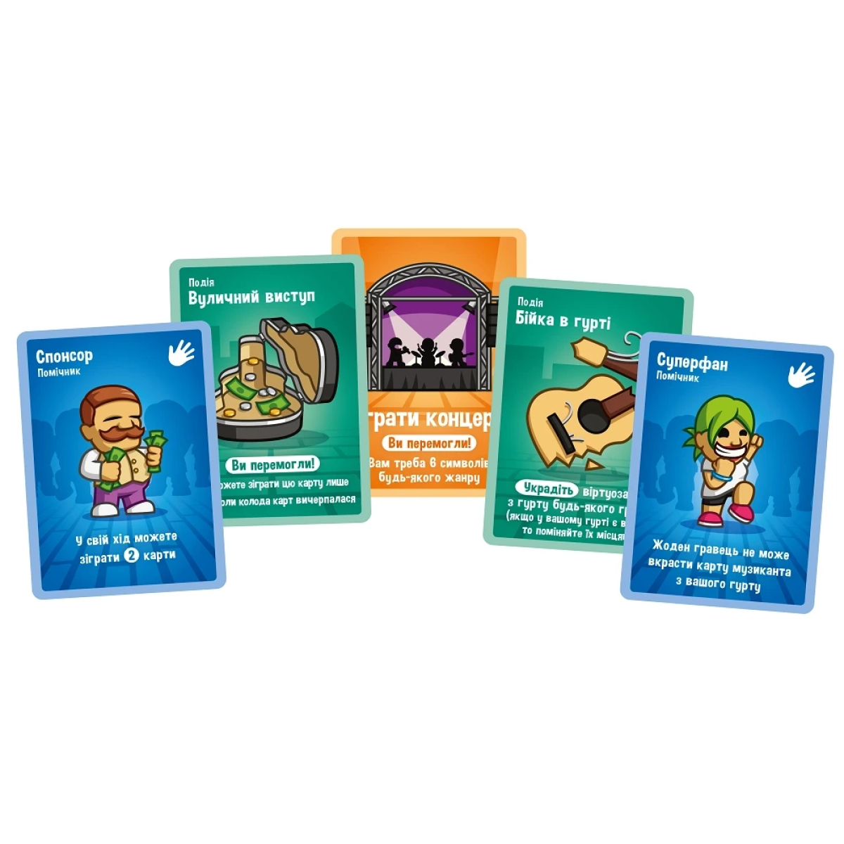 Фіолетові карти музикантів мають чотири типи-спеціалізації. у вашому гурті водночас може бути лише один вокаліст, віртуоз, басист або барабанщик. Кожен з них має талан до одного з трьох жанрів: рок, джаз і метал. Глибину пізнань музики відображено кількістю символів жанру внизу карти. Як тільки ви зіграєте музиканта, він одразу доєднується до вашого гурту. Та будьте обачними: продюсери-суперники можуть переманити учасників вашого гурту до себе ефектами карт!