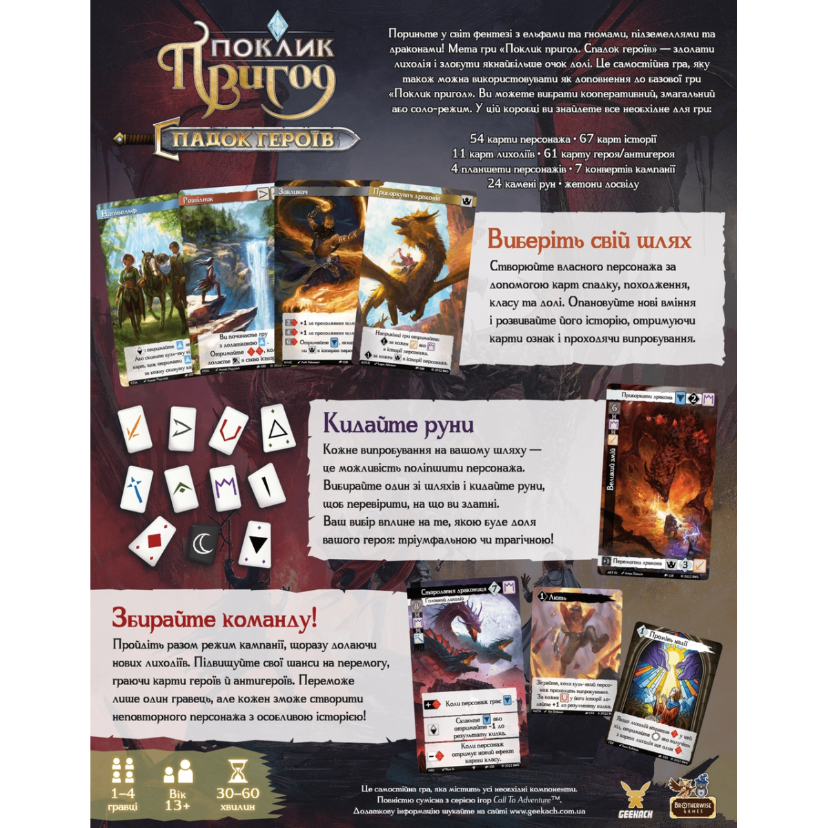 Поклик пригод. Спадок героїв — українська локалізація настільної кооперативної гри Сall to Adventure. Epic Origins. Гра занурить вас у фентезійну пригоду, де ви власноруч створюватимете історію свого персонажа, набиратимете бали долі, проходячи випробування, та зрештою об“єднаєтесь із товаришами, щоб перемогти головного лиходія. Гра натхненна популярною системою настільних рольових ігор D&D.