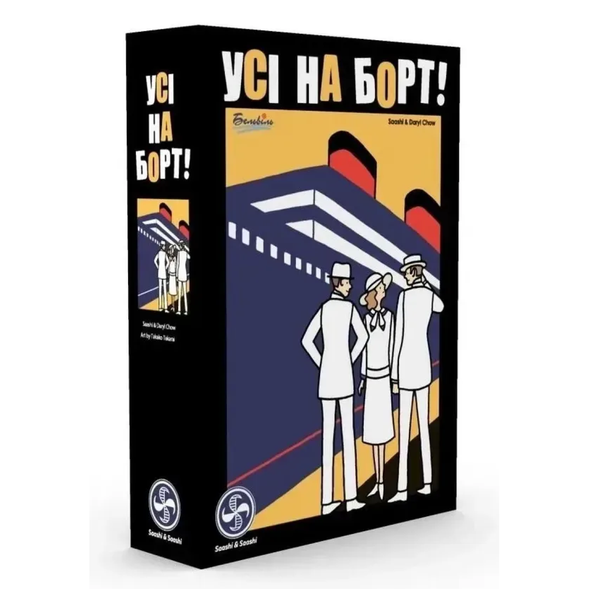 Усі на борт! — це яскрава сімейна стратегія, яка запрошує вас у неймовірну морську подорож, повну пригод, планування та трошки азарту! У цій грі гравці виступають у ролі туристичних менеджерів, які намагаються наповнити свій круїзний лайнер найкращими пасажирами й відправити його у плавання якомога швидше.