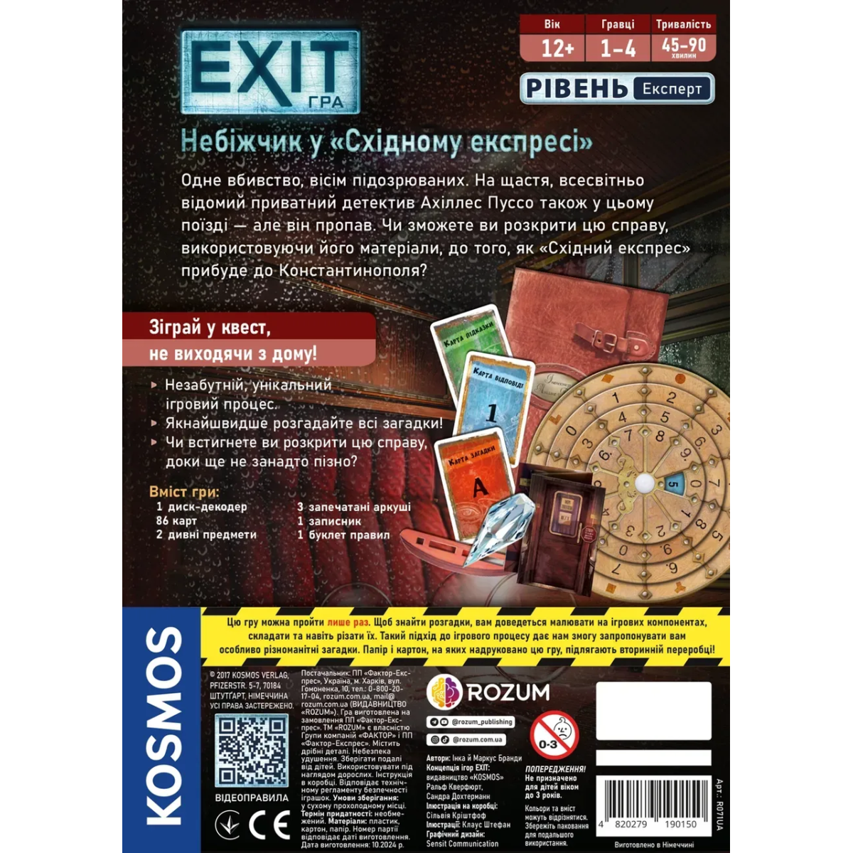 ???? EXIT: Небіжчик у “Східному експресі“ — це емоційна, напружена настільна гра-квест із серії EXIT, яка занурює вас у класичну детективну історію у стилі Агати Крісті. Ви опиняєтесь у знаменитому потязі, де сталося вбивство… І лише одна година, щоб розкрити злочинця!