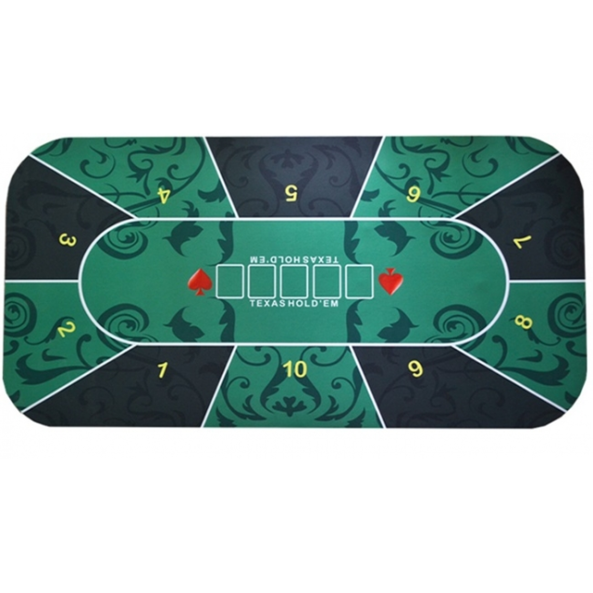 Це сукно розроблене з урахуванням усіх потреб гравців. Його стандартний розмір 120x60 см ідеально підходить для більшості обідніх столів, а спеціальна розмітка для “Техаського холдему“ допоможе легко орієнтуватися в ігрових зонах: для ставок, карт гравців та спільних карт. Класичний зелений колір сукна створює правильний настрій та знижує навантаження на очі під час довгих партій.