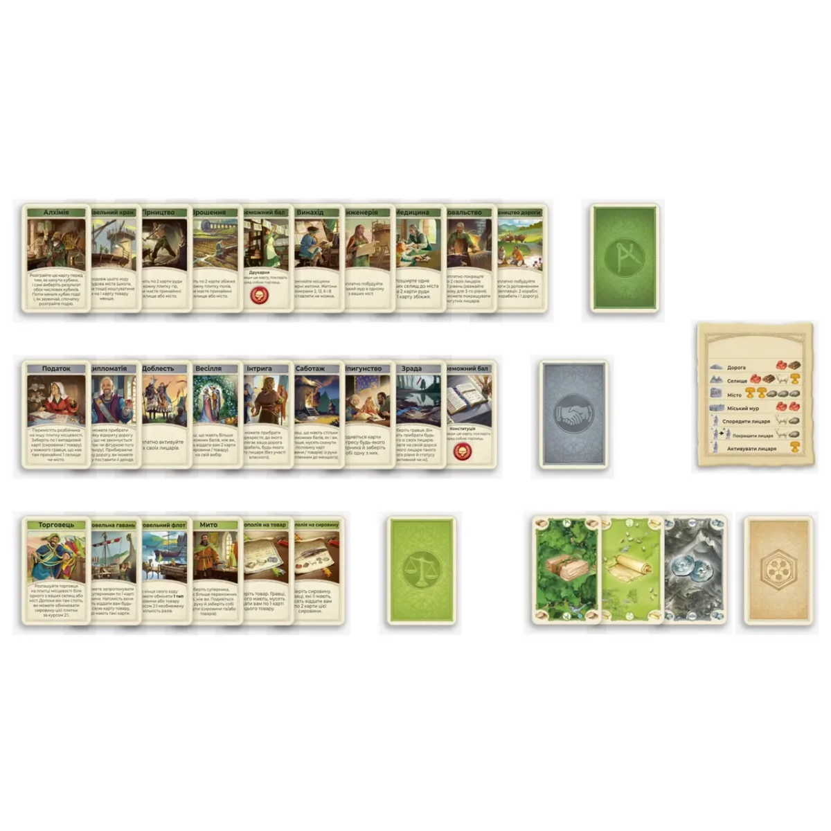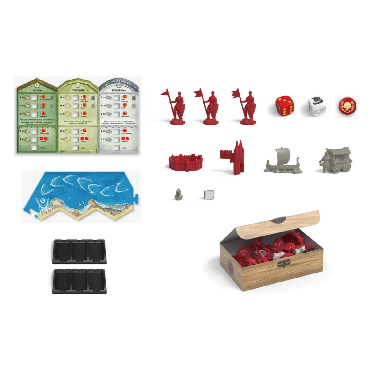 Набори фішок лицарів, компоненти для покращення міст, поле з кораблем варварів, нові карти прогресу й товарів, кубики та правила.