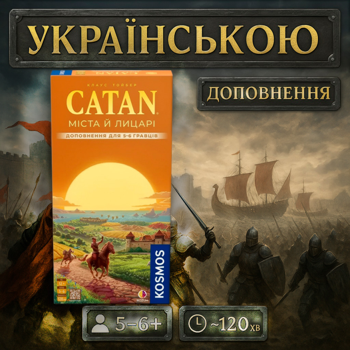 ???????????????? Для кого це доповнення: Це суто для тих, у кого вже є базова гра «Катан» і доповнення «Міста й лицарі», і хто хоче грати в нього вп“ятьох або вшістьох. Це ідеальне рішення для великих ігрових компаній та клубів настільних ігор.