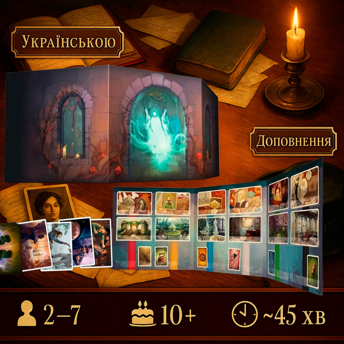 ???? Таємниця загибелі привида стає ще глибшою! Доповнення «Містеріум. Прихований мотив» пропонує вам і вашим друзям-екстрасенсам нові докази для розслідування. Чому було скоєно злочин? Це доповнення вводить нові карти мотивів, додаючи ще один шар у детективну історію.