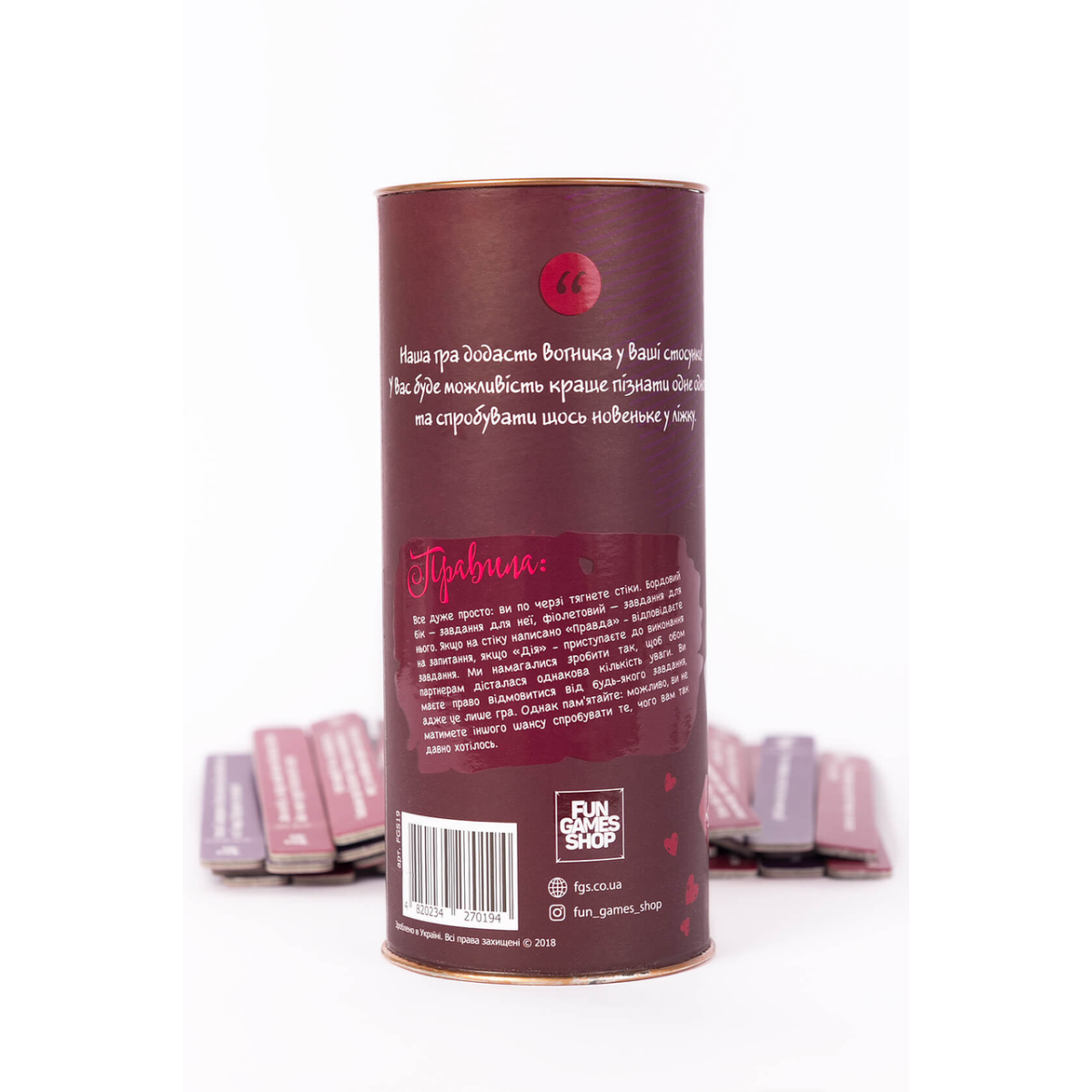 У стильному тубусі на вас чекають стіки двох видів: “Правда“ з інтимними запитаннями, що допоможуть розкрити найпотаємніші таємниці партнера, та “Дія“ із завданнями, що базуються на позах з Камасутри. Чи готові ви до гнучкості, довіри та абсолютно нового рівня близькості?