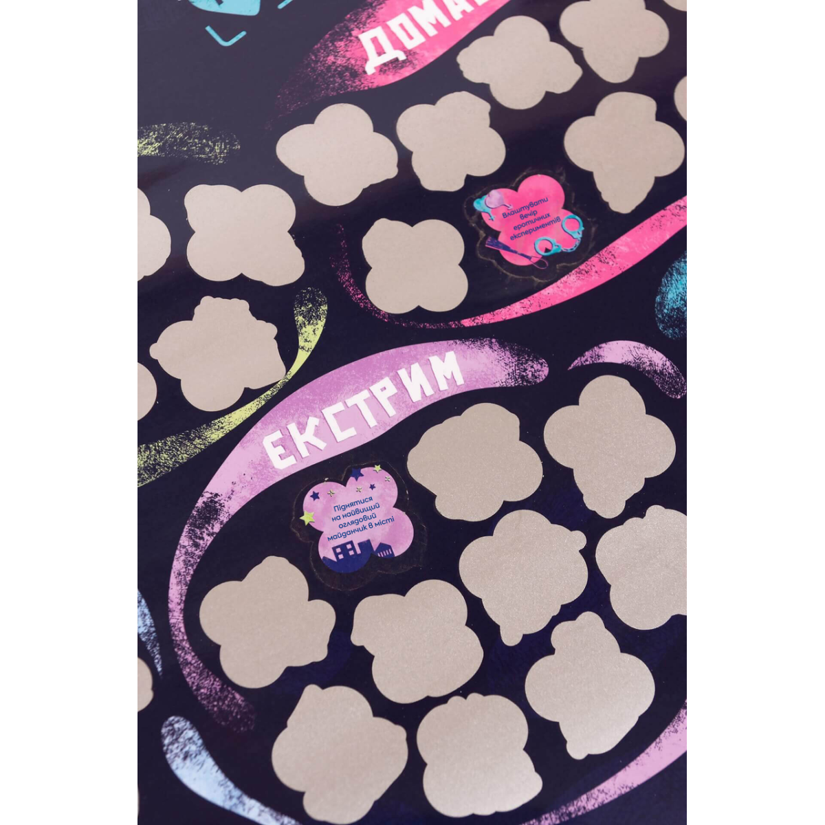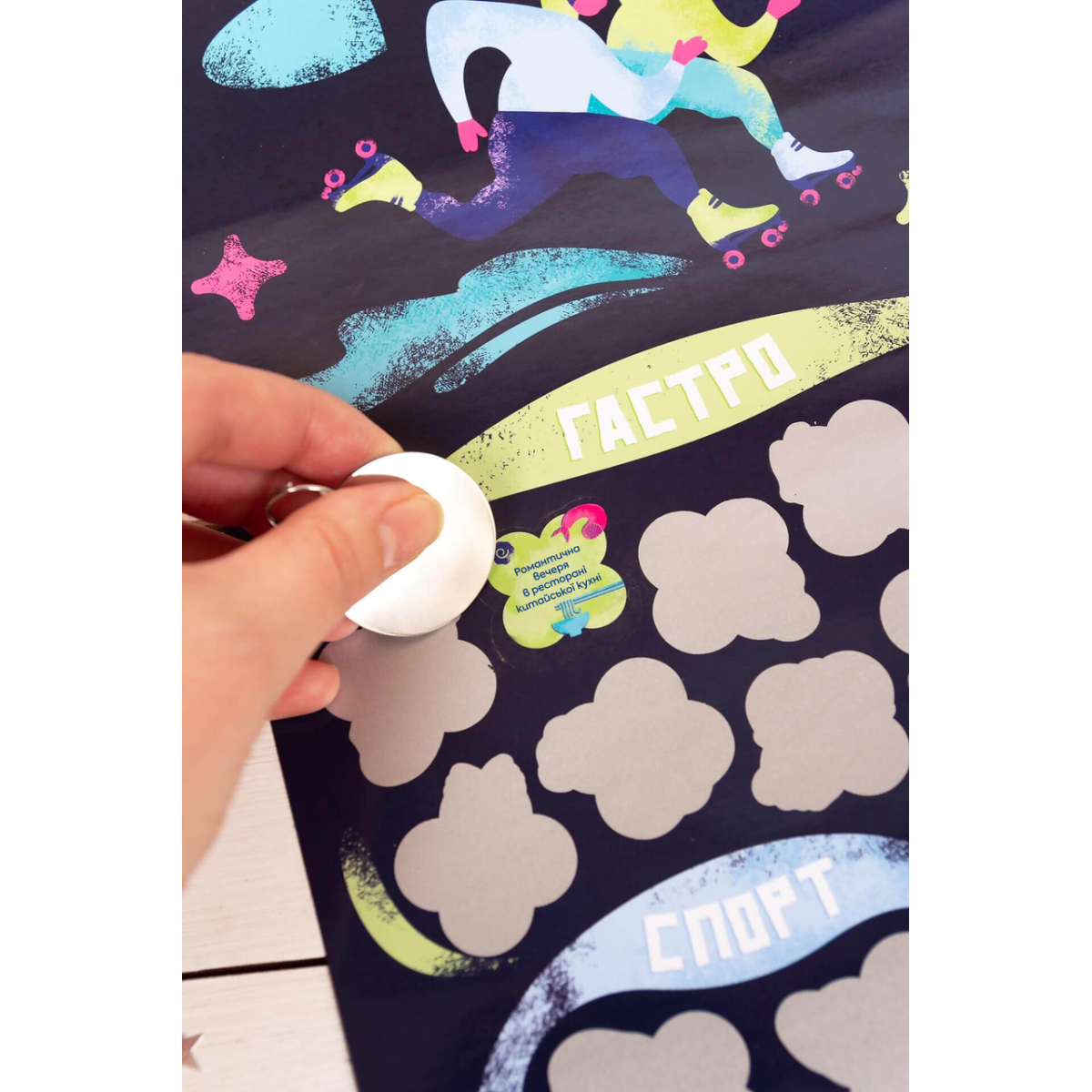 Правила прості: обираєте завдання, виконуєте його разом, а потім стираєте монеткою скретч-шар, відкриваючи яскраву іконку-спогад. Цей постер – не тільки мотиватор для нових звершень, а й стильна прикраса для вашого дому, яка щодня нагадуватиме про ваші спільні пригоди.