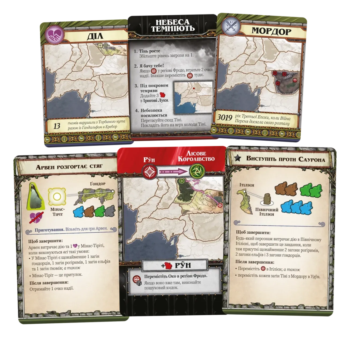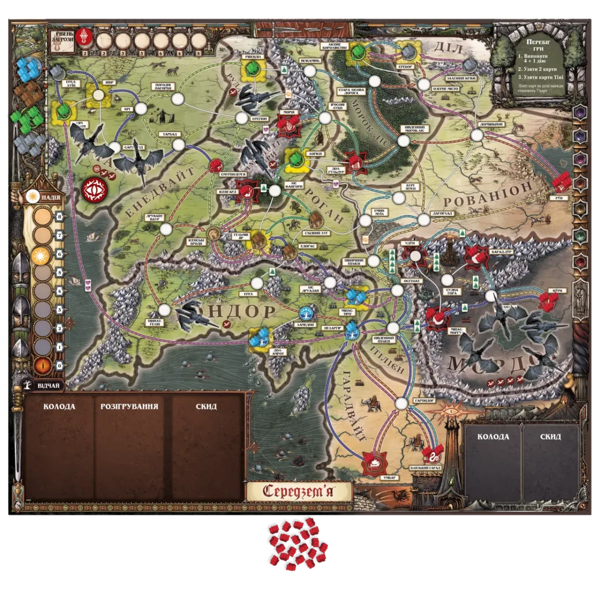 У цій асиметричній грі ви будете розігрувати карти персонажів та подій, щоб впливати на ключові локації з трилогії “Володар Перснів“. Гравець за Братство прагне провести Фродо до Фатальної гори, тоді як гравець за Саурона робитиме все можливе, щоб зупинити їх, використовуючи орків, назгулів та інші темні сили.