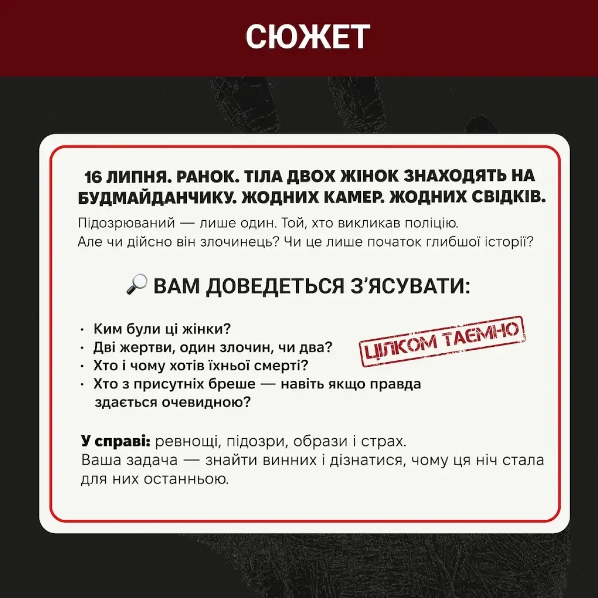 ???????????????? Для кого ця гра? “Нерозкриті справи“ – ідеальний вибір для компанії друзів, для пар або навіть для одного гравця, який любить складні загадки. Вона сподобається всім шанувальникам детективів, квестів у реальності, ескейп-румів та кримінальних серіалів.